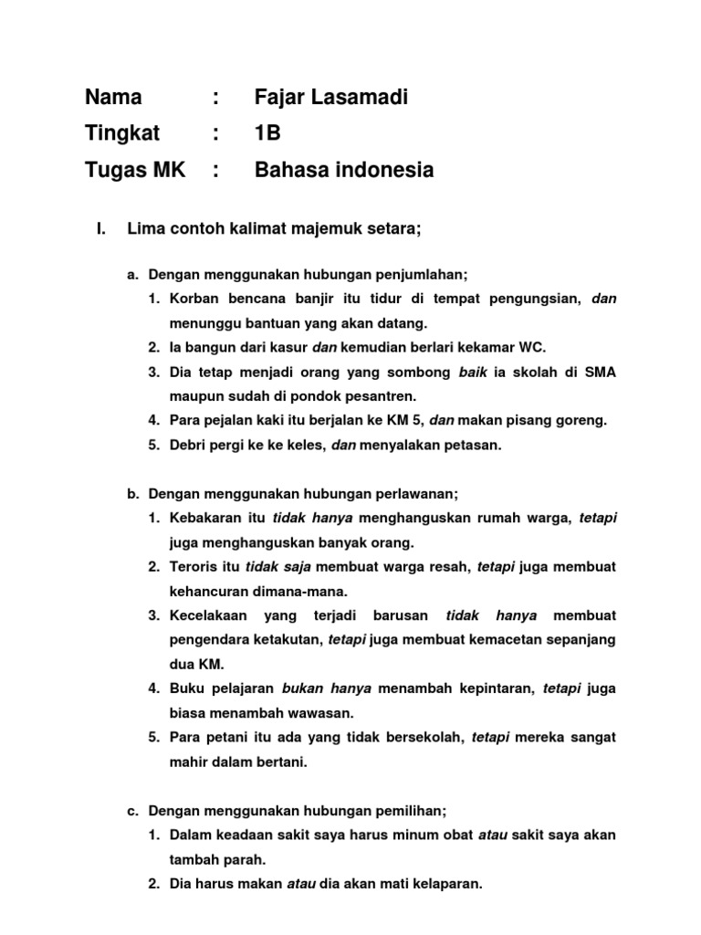 Jumlah klausanya pun lebih dari dua. Antara kalimat majemuk dengan kalimat lainnya dibedakan berdasarkan bentuk dan pola kalimatnya. Kata tugas untuk menghubungkan kalimat ini. Arsyad rajin berlatih olahraga sepak bola sehingga dia menjadi atlet sepak bola terbaik di indonesia. Ada dua kelompok kata dalam masing masing kalimat contoh di atas. Adik mau dibelikan tas sekolah baru atau sepatu sekolah baru.