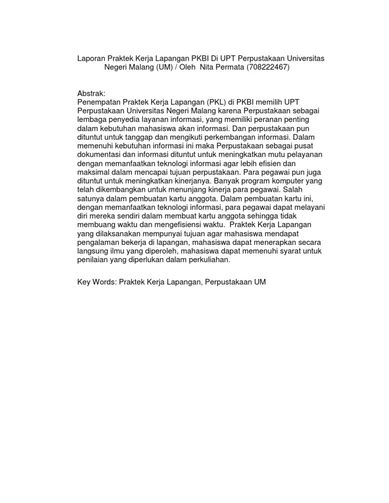 Berikut adalah contoh abstrak. Contoh laporan prakerin buat kalian yang duduk di bangku sekolah menengah kejuruan pasti akan mengalami yang namanya praktik kerja industri prakerin atau biasa juga disebut praktik kerja lapangan pkl. Mengikutiujiannasional un tahunpelajaran 20132014 lambang sekolah. Contoh laporan untuk kamu yang masih yang masih bingung dalam membuat laporan pkl atau prkerin silahkan simak artikel berikut ini karena dalam artikel ini akan dibahas tuntas mengenai pedoman membuat laporan pkl contoh laporan pklprakerin yang baik dan benar. 11 latar belakang kegiatan. Magang adalah kegiatan yang dilakukan mahasiswa tingkat akhir atau siswa smk kelas 3 dimana mereka mencari pengalaman kerja dengan langsung terjun ke lingkungan pekerjaan atau sering disebut praktek kerja lapangan pkl.