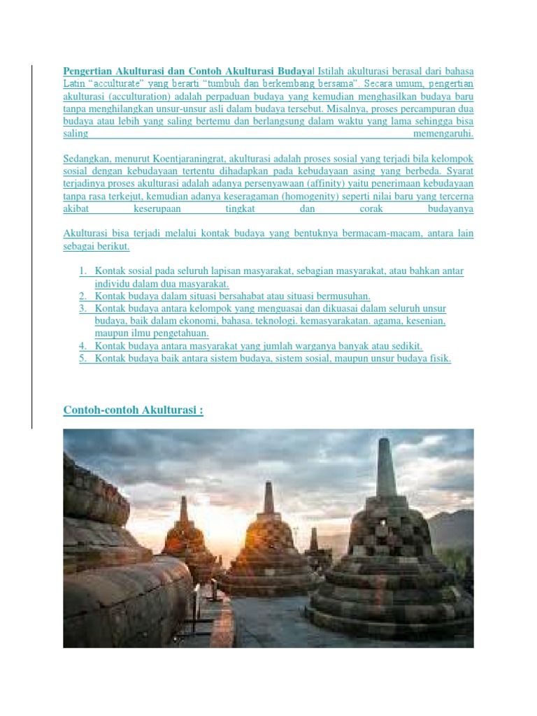 14 contoh akulturasi budaya di indonesia merupakan percampuran dua budaya hal ini yang membuat budaya di indonesia semakin beragam dalam banyak hal. Bentuk candi candi di indonesia pada hakikatnya adalah punden berundak yang merupakan unsur indonesia asli. Candi borobudur merupakan salah satu contoh dari bentuk akulturasi tersebut. Contoh akulturasi kebudayaan indonesia dengan kebudayaan islam. Menurut kamus besar bahasa indonesia kbbi akulturasi adalah percampuran dua kebudayaan atau lebih yang saling bertemu dan saling memengaruhi. Sebagai contoh bule yang fasih berbahasa indonesia karena tinggal lama di indonesia pasangan artis beda negara yang masing masing mengadopsi budaya negara asal dalam hal bahasa pakaian dan lain sebagainya.