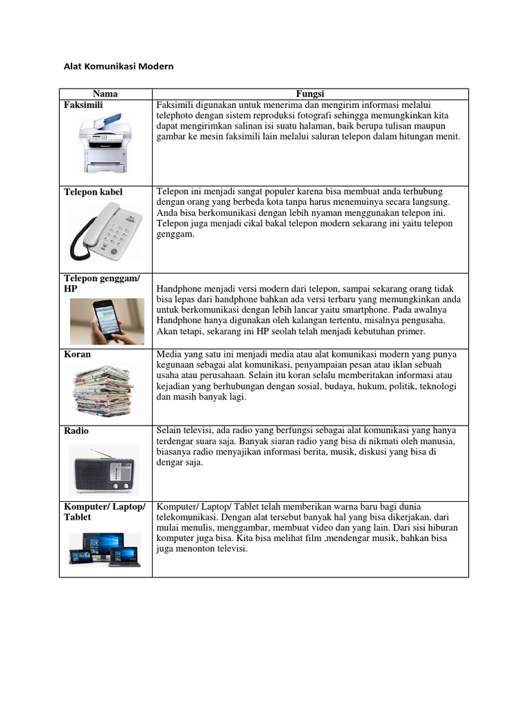 Fungsi utama dari telepon genggam ini selain sebagai alat untuk menelepon alat ini juga mampu untuk melakukan hal lain seperti mengirim pesan tertulis pesan suara hingga berselancar didunia internet. Kelebihan dari alat modern adalah memungkinkan resipien bisa membalas pesan informasi dengan cepat mampu menampilkan wujud pengirim secara nyata dan lebih mudah dipahami semua kalangan. Alat komunikasi modern merupakan alat yang bisa menghubungkan dua orang komunikan atau lebih supaya bisa berinteraksi dengan mudah melalui alat yang memiliki teknologi. Alat komunikasi zaman dahulu. Bahkan alat komunikasi seiring berkembangnya zaman kini bukan hanya sebagai penyampai pesan atau informasi saja melainkan juga sebagai penghasil pesan atau informasi juga. Simak beberapa contoh alat komunikasi modern di sini.