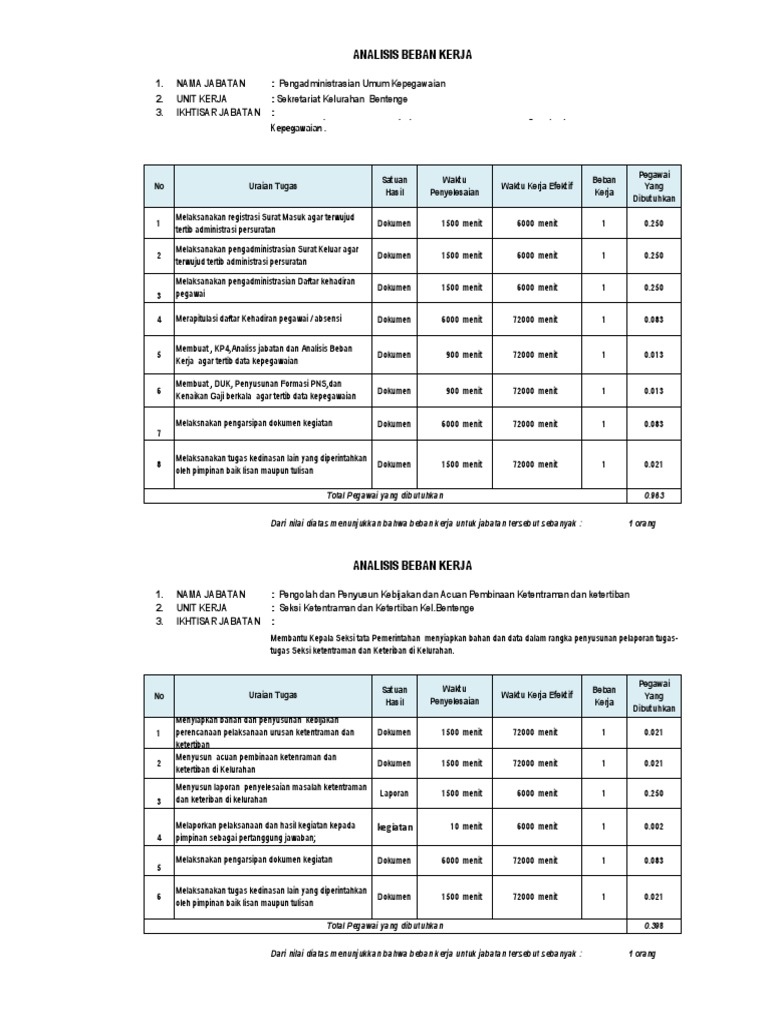 Analisis jabatan untuk menghasilkan 1 uraian jabatan diperlukan waktu berapa lama untuk menyelesaikannya misalnya 90 menit. Sasaran strategikebijakan program dan kegiatan tahunan7 finalisasi dokumen renstrab. Tahapan penyusunan skp. No uraian tugas satuan waktu standar beban pegawai hasil penyelesaian kinerja kerja yang dibutuhkan1 menerima dan laporan 15 mnt 300 mnt 7 035 mengumpulkan laporan2 mensortir dan laporan 30 mnt 300 mnt 6 06 mengklarifikasi laporan 3 menyiapkan data kegiatan 15 mnt 72000 1 0002 beban kerja mnt 4 melaporkan kepada laporan 15 mnt 72000 1 0002 pimpinan bahan mnt konsep laporan tahun 5. Pedoman analisis jabatan dan beban kerja berdasarkan peraturan menteri pendayagunaan aparatur negara dan reformasi birokrasi tentang pedoman analisis jabatan dan analisis beban kerja lewat permenpan rb nomor 1 tahun 2020.