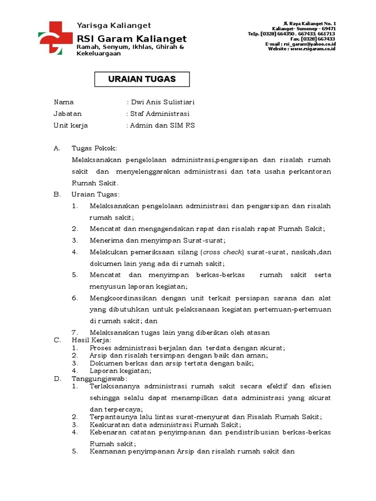 1 instansi terkait di luar pemkot wewenang hubungan kerja tolok ukur keberhasilan nama jabatan rincian jabatan skpdunit kerja fungsi utama jabatan melaksanakan fungsi analisa data teknis dengan teori danatau hukum dengan metode analisis kuantitatif maupun kualitatif. Menganalisis jabatan tugas dan uraian pekerjaan pada kegiatan administrasi 1. Kumpulan materi administrasi perkantoran. Contoh job description. Menganalisis jabatantugasuraian pekerjaan pada kegiatan administrasi pengertian organisasi kantor istilah organisasi berasal dari bahasa yunani yaitu organon atau dalam bahasa latin organum yang berarti alat bagian anggota atau badan. Sub bagian umum dan kepegawaian 4.
