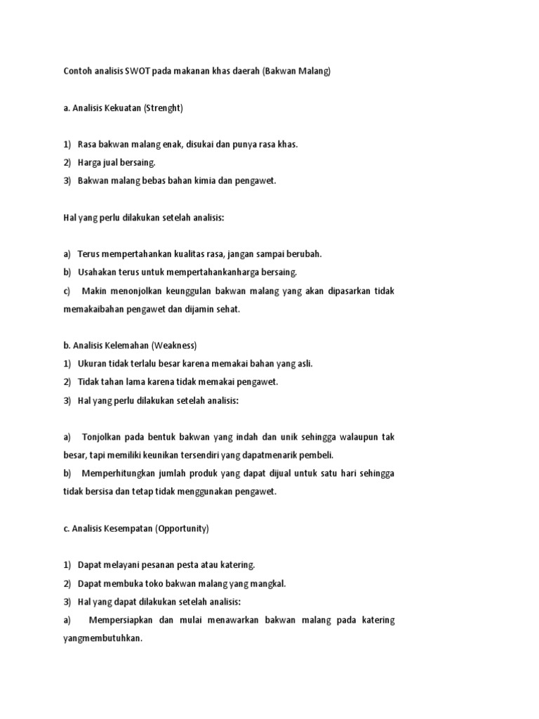12 contoh analisis swot usaha makanan penjualan bakso. Untuk membantu anda memahami dengan lebih baik seperti apa contoh swot sebenarnya kami akan memberikan contoh kasus yang bisa anda pelajari. Analisis swot pengertian manfaat unsur cara membuat dan contohnya memimpin suatu perusahaan yang mampu mengelola kegiatan tertentu pasti membutuhkan sistem serta ketentuan tertentutujuannya tentu saja agar menjaga suatu perusahaan tetap berjalan dan untuk dapat bersaing dengan pesaing lainnya. Mulai dari contoh analisis swot diri sendiri contoh analisis swot perusahaan contoh analisis swot usaha kecil contoh analisis swot produk makanan contoh analisis swot usaha batik contoh analisis swot perusahaan makanan contoh analisis swot organisasi contoh analisis swot usaha butik contoh analisis swot produk kerajinan dll. Mereka menjual makanan khas indonesia dan juga gudeg kalengan serta bermacam macam oleh oleh khas jogja. Gudeg arini restoran makanan khas indonesia di sekitaran jogjakarta.