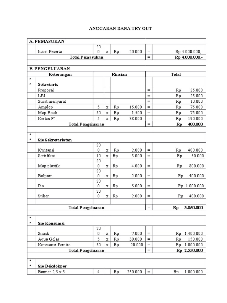 Contoh proposal kegiatan proposal adalah rencana kegiatan yang dituliskan dalam bentuk rancangan kerja yang akan dilaksanakan. Ketersediaan dana adalah salah satu faktor penentu sukses atau tidaknya suatu acara. Pihak yang berkepentingan tersebut antara lain pemberi izin dan penyumbang dana seperti kepala sekolah orang tua sponsor polisi lurah atau kepala desa. Gerakan pramuka bertujuan membentuk manusia yang berkepribadian dan berwatak luhur yang sehat jasmani dan rohaninya serta menjadi warga negara republik indonesia yang berjiwa pancasila setia dan patuh kepada negara kesatuan republik indoesia sehingga menjadi anggota masyarakat yang baik dan berguna yang dapat membangun dirinya masyarakat bangsa dan negara. Ada baiknya rincian biaya yang dibutuhkan sudah diperhitungkan secara logis dan juga realistis baik dari segi pemasukan dan juga pengeluarannya. Contoh rencana anggaran dana kegiatan.