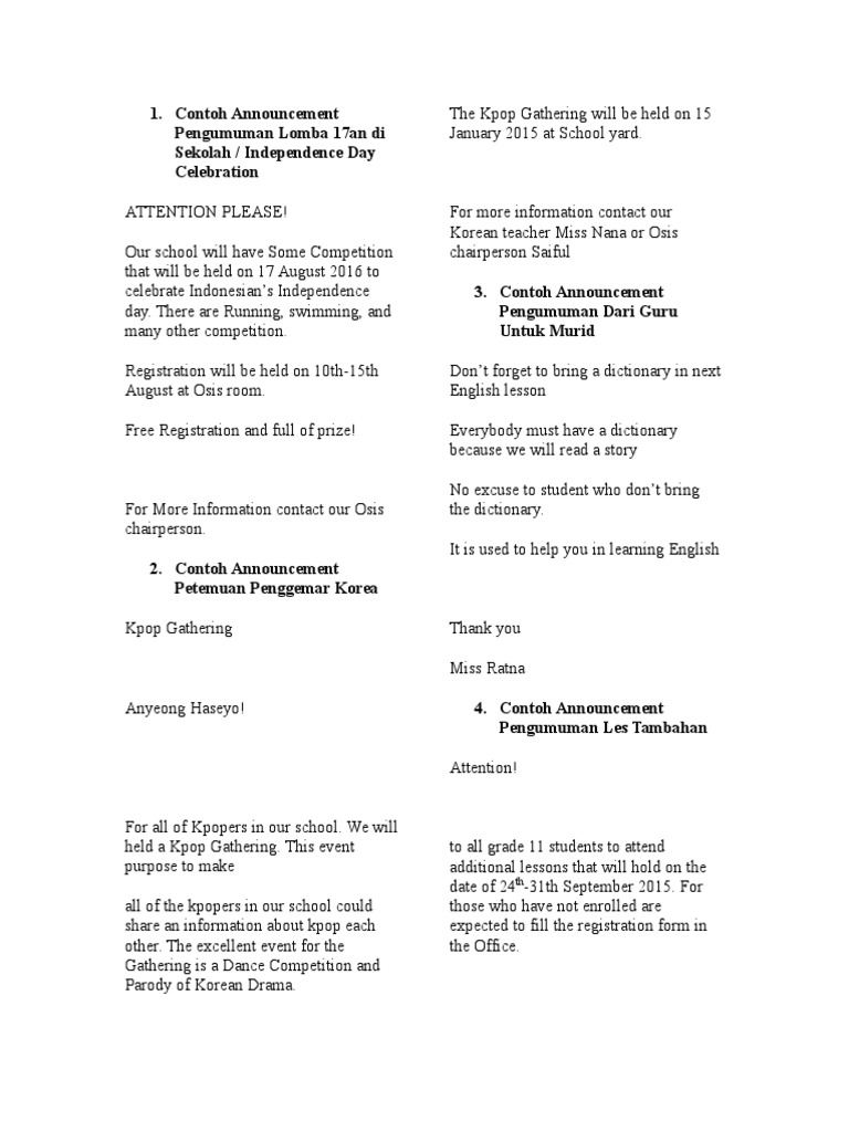 Contoh announcement school activity. All students of class eight a are supposed to gather in the school yard on friday october 16 th 2016 after school for preparing kultum ennglish contect. To describe an outdoor activity on school holiday c. Dari sekian banyak materi bahasa inggris mungkin kalian pernah mendengar atau bahkan mempelajarinya materi announcement pengumuman. For further information please contact mr. Announcement berasal dari kata announce. Oleh rahayu may diposting pada 28112019.
