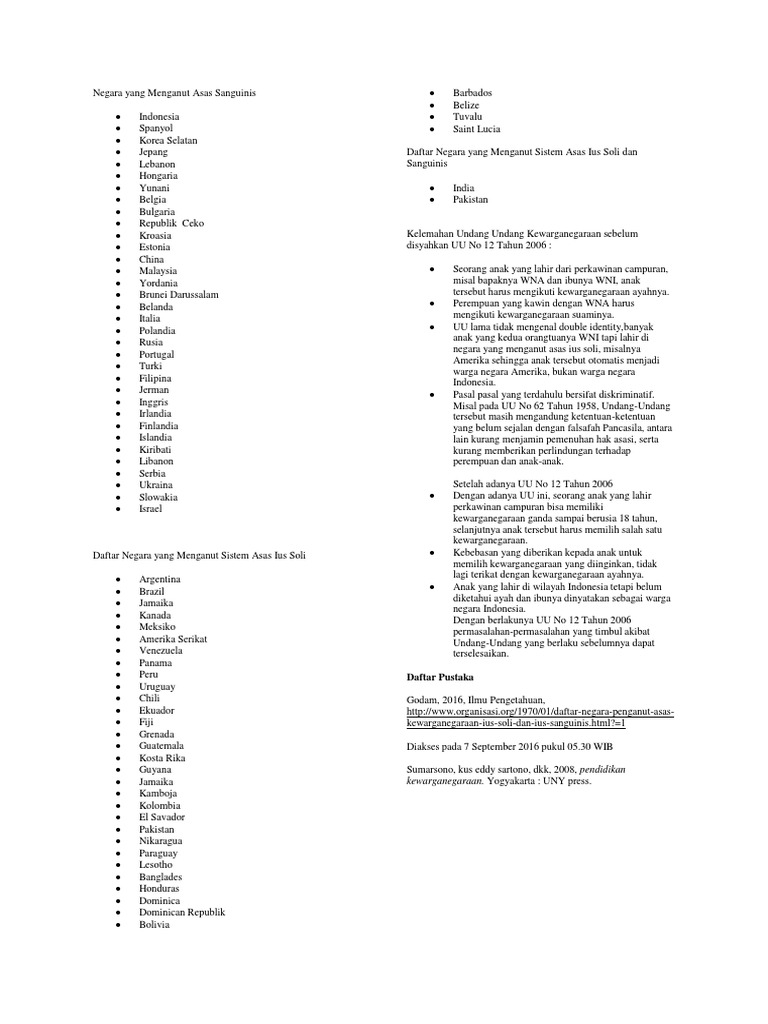 Negara yang menerapkan asas ini adalah republik rakyat tiongkokkebanyakan bangsa yang memiliki sejarah panjang menerapkan asas ini seperti negara negara di eropa dan. Asas ius sanguinis atau jus sanguinis bahasa latin untuk hak untuk darah adalah asas pemberian kewarganegaraan berdasarkan keturunan orang tuanya. Contohnya seseorang dilahirkan di negara indonesia sedangkan orang tuanya berkewarganegaraan negara belanda maka ia adalah warga negara belanda. Dalam berbagai literatur hukum dan dalam praktik dikenal adanya 3 asas kewarganegaraan masing masing adalah ius sanguinis ius soli dan asas campuran. Diantara negara yang menerapkan asas ius sanguinis ini ialah belanda inggris jerman serta filipina. Negara yang menganut asas ini akan mengakui kewarganegaraan seorang anak sebagai warga negaranya apabila orang tua dari anak tersebut adalah memiliki status kewarganegaraan negara tersebut dilihat dari keturunannya.