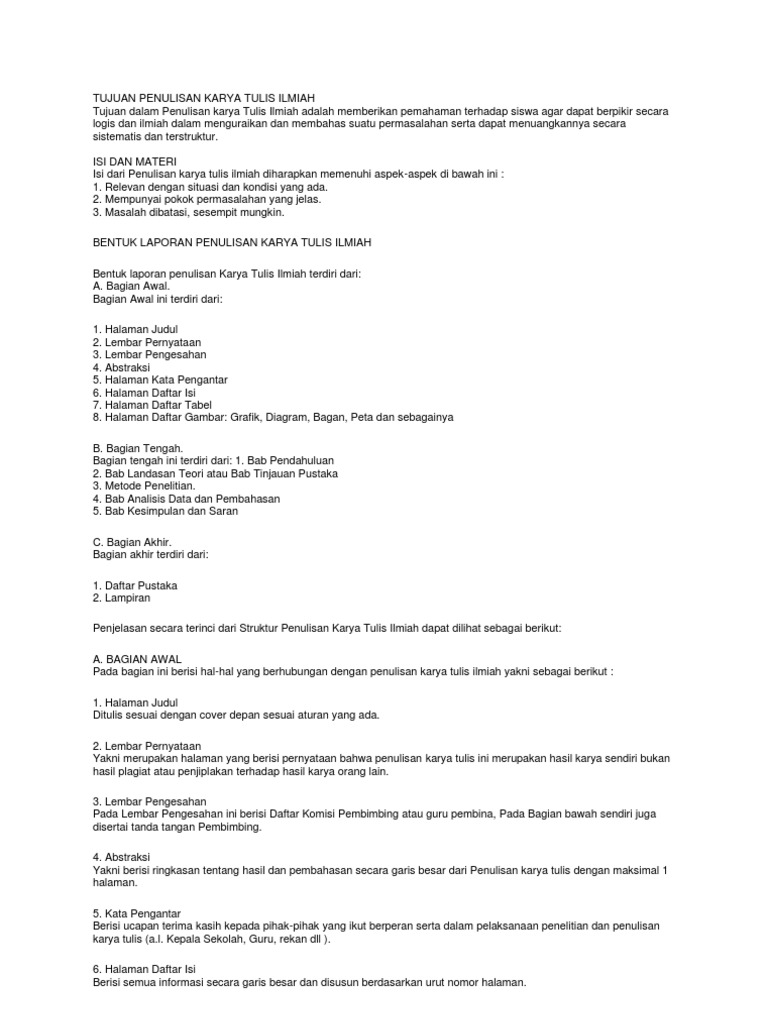 Karya tulis ilmiah ini disusun sebagai syarat untuk memenuhi tugas mata pelajaran bahasa indonesia kelas xi ips semester genap tahun ajaran 20102011 sma negeri 3 metro dengan harapan dengan harapan. Pada karya tulis ilmiah ini penulis menggunakan. Namun penelitian tidaklah mudah karena ada banyak langkah dan metode yang harus di lakukan di dalamnya. Di dalam abstract harus sudah memuat latar belakang tujuan landasan teori metode pembahasan dan kesimpulan. Karya tulis ilmiah penelitian yang diprioritaskan bagi guru adalah penelitian yang terkait langsung dengan tugas pokok dan fungsinya serta berdampak langsung terhadap peningkatan kualitas pembelajarandalam hal ini terdapat dua macam penelitian yang dapat dilakukan sesuai tujuan tersebut yaitu. Bagian inti dari karya tulis ilmiah.