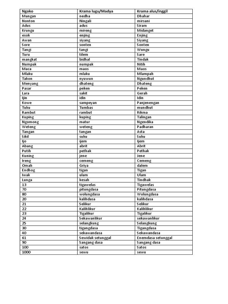 Translete bahasa jawa negara kita dikenal sebagai bangsa yang memiliki banyak keanekaragaman baik suku dan bahasa yang seperti yang anda tahu orang jawa memiliki beberapa tingkat tutur bahasa yang berbeda beda yang digunakan untuk berbicara dengan orang yang berbeda. Yang dimaksud dengan ngoko alus adalah bentuk unggah ungguh yang di dalamnya bukan hanya terdiri atas leksikon ngoko dan netral saja melainkan juga terdiri atas leksikon krama inggil krama andhap atau leksikon krama yang muncul di dalam ragam ini sebenarnya hanya digunakan untuk menghormati mitra wicara orang ke 2 atau 3 sasangka 200499 100. Unggah unguh basa mau digunakake ngurmati antarane wong siji lan liyane sing diajak guneman. Mbah kakung midhangetaken siyaran ringgit wacucal pakdhe tindak dhateng tawangmangu nitih bis. Berbagi ke twitter berbagi ke facebook. Unggah ungguh mau kaperang maneh dadi loro yaiku ngoko lan krama.