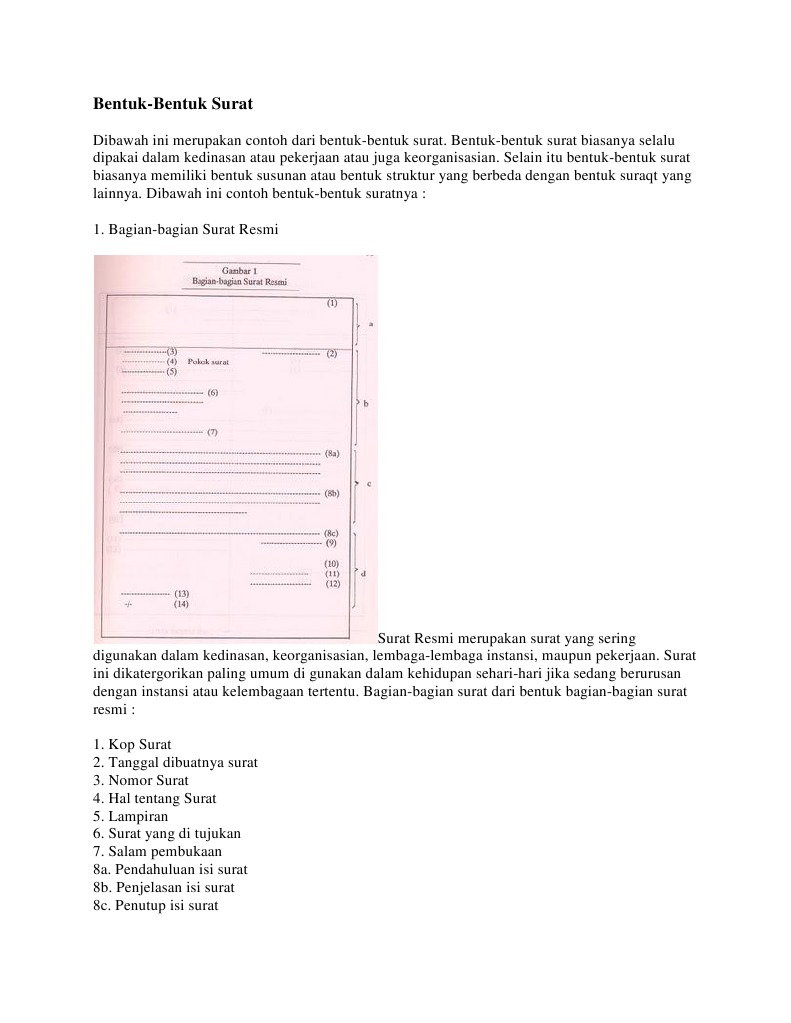 Contoh bentuk bentuk surat. Adapun fungsi surat antaralain alat untuk mengingat sebagai dokumen yang bersifat tertulis. Secara rinci menurut agus sugiarto 20052 pengertian surat adalah instrumen untuk penyampaian pesan dari ke kubu lain dengan syarat tertentu seperti pemakaian kertas pemakaian bentuk adanya notasi dan kode menggunakan bahasa yang spesifik dan pembubuhan tanda tangan. Seperti kepala leher badan sampai dengan kaki. Setelah saya memperoleh dan selesai membacanya kali ini akan saya bagikan kepadamu yang sedang menerka nerka benar atau salahnya dari bentuk surat resmi indonesia. Masing masing bagian surat ini mempunyai peranan yang sangat penting untuk menunjukkan ciri khas dari niasing masing bentuk surat. Pengertian surat surat adalah alat komunikasi tertulis untuk menyampaikan pesan kepada pihak lain yang memiliki persyaratan khusus yaitu penggunaan kode 2 notasi lampiran dan perihal penggunaan kertas penggunaan model dan bentuk pemakaian bahasa yang khas serta pencantuman tanda tangan.