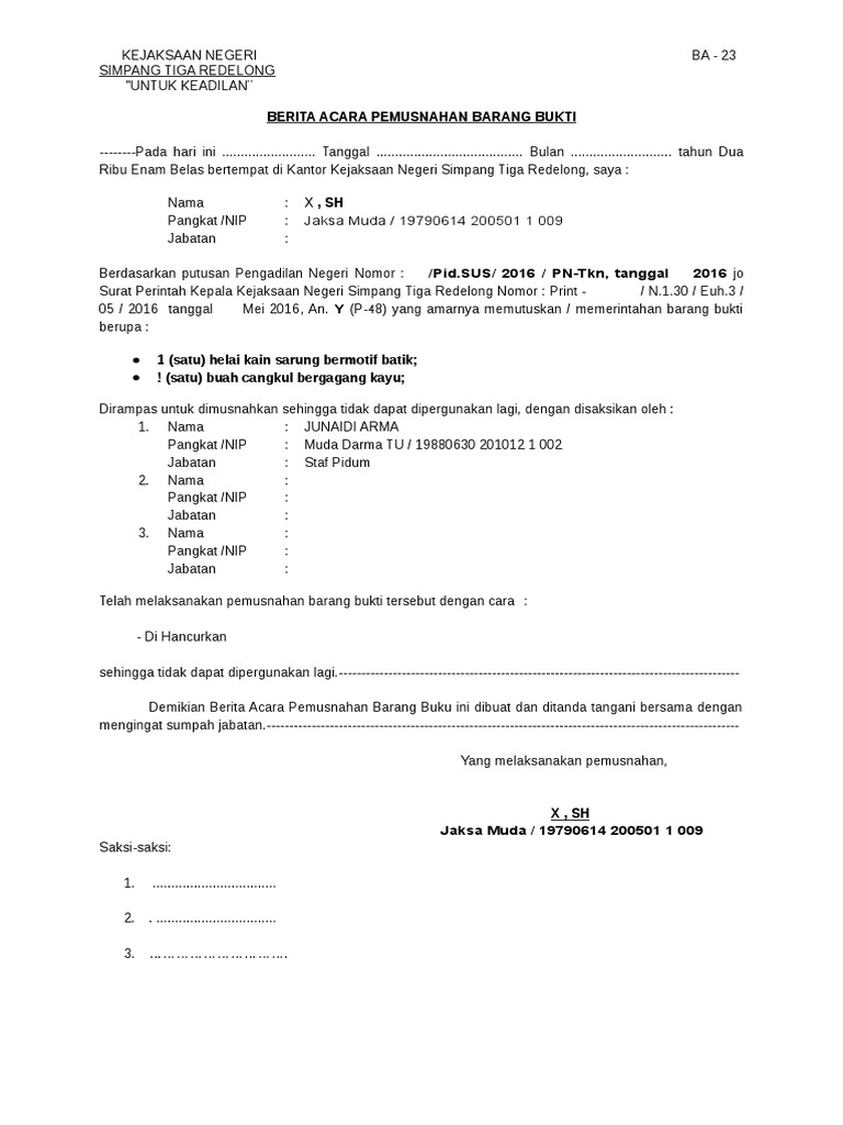 Contoh berita acara pemusnahan barang. Baik itu menyangkut rapat kehilangan kerusakan serah terima barang peristiwa penyelesaian pekerjaan perubahan status dan masih banyak lagi lainnya. Bagi suatu permasalahan masalah baik berupa pelaksanaan perencanaan ataupun pengendalian kebijaksaan pimpinan. Berita acara tersebut memuat pernyataan pengesahan mengenai suatu kegiatan. Bertempat di telah melaksanakan pemusnahan barang berupa. Barang tersebut telah diperiksa dan terdapat rusakcacat produksi dan tidak memungkinkan untuk digunakan kembali. Bagi anda yang saat ini mau melakukan aktivitas di dunia bisnis tidak salahnya jika anda membaca artikel yang akan kami bahas dikesempatan ini.