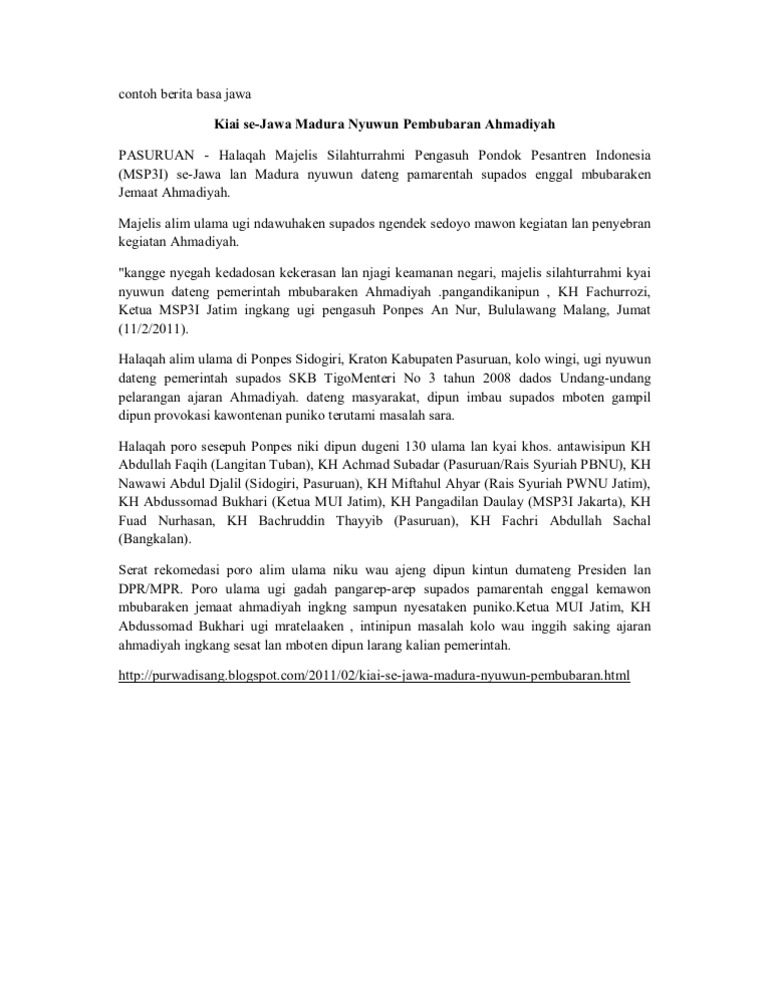 Artikel 59 event 21 profil 12 agenda 7 lokasi 2 kontak 1 testimoni 1 contoh surat berita lelayu bahasa jawa. Contoh berita dalam bahasa jawa pawarta basa jawa as rusalak gajah gajah padha ngamuk desa cacah 9 ing wewengkon kabupaten organ komering ulu oku selatan sumatra selatan dilapurake diserang gerombolan gajah selasa 211. Cerita rakyat asal mula rawa pening jawa tengah. Contoh surat berita lelayu bahasa jawa pawartos lelayu kami menyajikan informasi seputar madrasahinfo sosial umum. Berita bahasa jawa ojo nesu merupakan track ketujuh dari album soekamti day milik endank soekamti yang rilis pada tahun 2016. Kamis 18 juli 2019 edit.