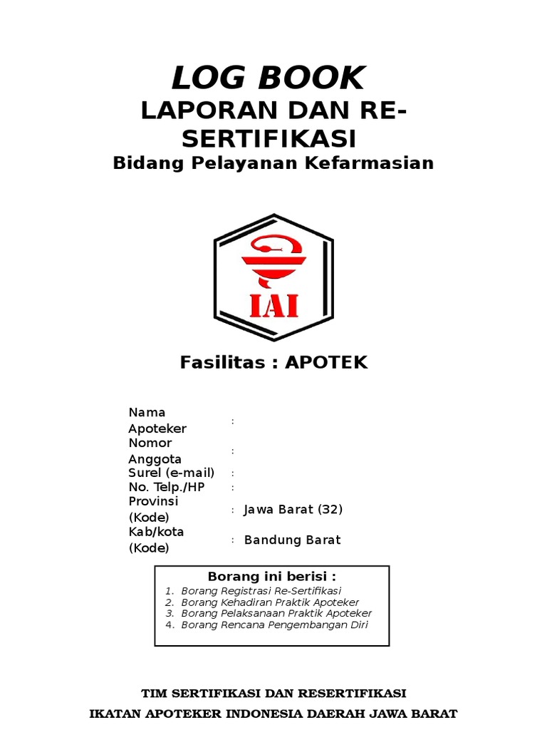 Telah terdaftar sebagai anggota ikatan apoteker indonesia 2. 18011963000997 borang ini berisi. Save save contoh borang yg sdh diisidocx for later. Log book borang adalah bukudokumen yang berisi rangkuman tertulis yang disampaikan oleh apoteker guna memenuhi ketentuan re sertifikasi. Borang kehadiran praktik apoteker 3. Borang rencana pengembangan diri 2.