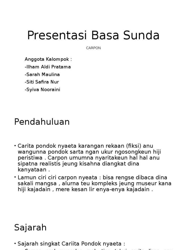 Contoh carpon basa sunda singkat. Carpon bahasa sunda singkat balada tukang nyuling. Karena ceritanya yang relatif pendek carita pondok atau carpon juga hampir sama seperti dongeng. Modul kewirausahaan pengertian visi dan misi. Home unlabelled carita pondok basa sunda. Gagak teh sorana digedekeun ngomongna oge basa betawi da sieunen katara engga gaaaa. Nu mawi dinamian selat sunda lantaran raden sundana sarakah hoyong wilayah anu raina.