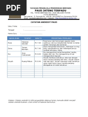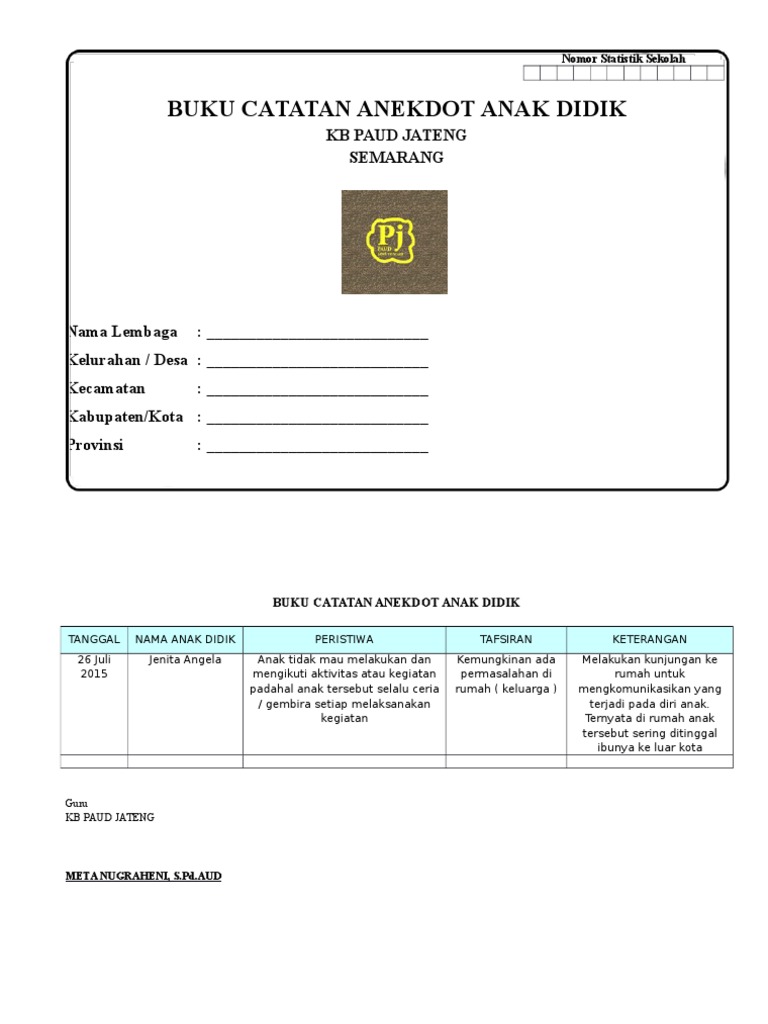 Contoh format catatan penilaian anekdot paud tk ra kurikulum 2013 merupakan alat perekam observasi secara berkala terhadap suatu peristiwa atau kejadian penting yang melukiskan perilaku anak yang terjadinya tidak umum atau kejadian khusus yang diuraikan dalam bentuk pernyataan singkat dan obyektif. Jangan lupa untuk dibagikan supaya lebih bermanfaat. Pengertian satatan anekdot adalah salah satu alat untuk mengumpulkan data tentang tingkah laku yang diluar dari kebiasaannya. Materi dapat digunakan dari mulai pendidikan anak usia dini paud sampai perguruan tinggi seperti jurusan akuntansi teknik komputer manajemen kedokteran filsafat teologigeografi ekonomi teknologi industri pertanian. Contoh catatan anekdot paud kober tk dan tpa format pdf minggu november 27 2016 tambah komentar administrasi paud buku catatan anekdot siswa jenjang paud dalam format pdf ini kami bagikan kepada bapakibu yang kebetulan mengajar baik di kelas a usia 4 5 tahun atau kelas b usia 5 6 tahun sebagai catatan dan solusi dalam menuntaskan setiap permasalahan yang dialami siswa di kelassekolah. Download contoh format buku catatan anekdot paud tk kb tpa sps format doc yang dapat di edit dengan mudah.