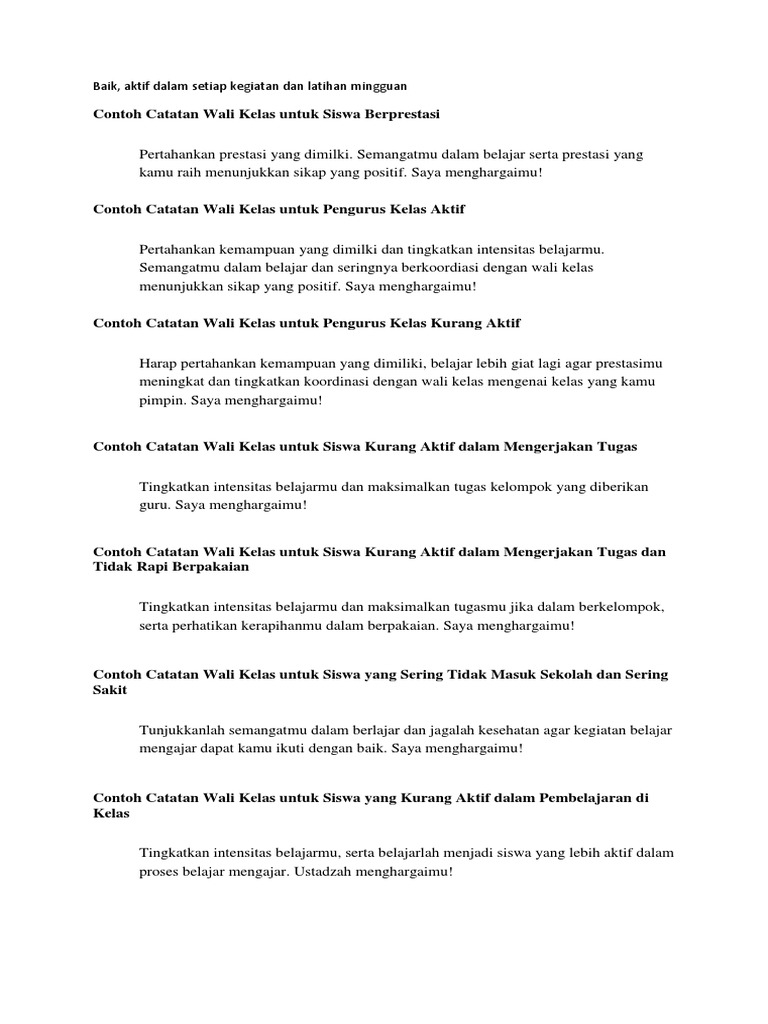 Contoh catatan guru wali kelas di raport k13 author. Blog sederhana ini semoga bisa bermanfaat bagi saya dan para pengunjung. Jangan protes kalo blog ini penuh warna hijau yah. Anita catatan dari ibu untuk semester depan adalah. Administrasi pendidikan administrasi ujian membuat sebuah narasi untuk pengembangan peserta didik sudah pasti menjadi prioritas bagi seorang wali kelas nah kali ini admin akan berbagai contoh catatan guru wali kelas di raport k13 yang dapat membantu pendidik dalam meningkatkan semangat anak didik untuk giat belajar. Contoh kata kata catatan wali kelas di raport.