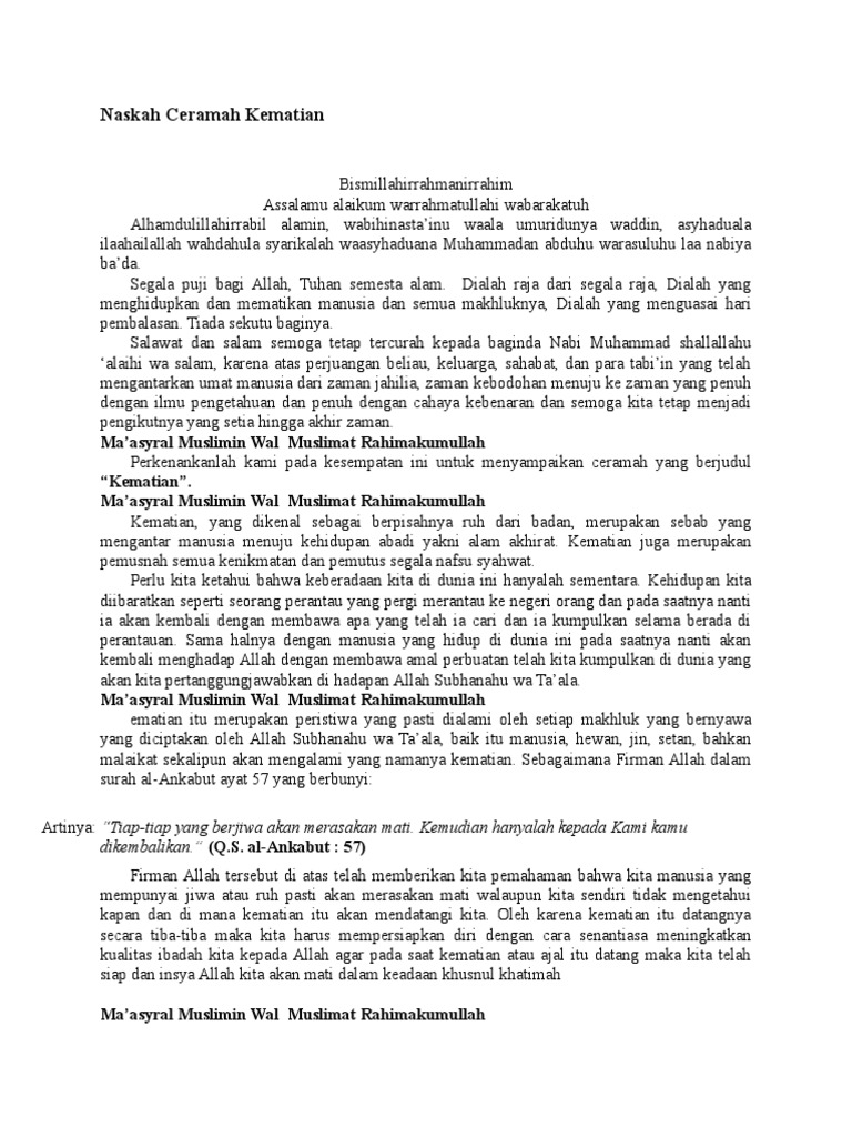 Materi ceramah tentang kematian ditutup dengan doa minta ampunan untuk almarhum dan untuk hadirin. Contoh contoh ceramah ini bisa dikulik untuk digunakan dalam ceramah anda atau sekadar dibaca untuk mempertebal keimanan terhadap allah swt. Jika ditelaah lebih jauh ceramah memiliki banyak peran dalam kehidupan salah satunya menjadikan seseorang berubah ke arah lebih baik dan tentunya menambah wawasan tentang banyak hal. Dan banyak sekali ceramah keagamaan tentang kematian yang bisa kita jadikan alarm. Kumpulan ceramah agama jumat 16 maret 2012. Contoh teks ceramah ceramah atau biasa dikenal dengan pidato merupakan tindakan untuk berbagi ilmu dari para ahlinya.