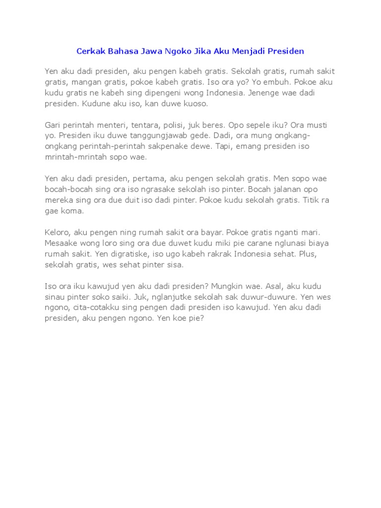 Jawa contoh cerita cekak bahasa jawa contoh cerita cekak bahasa jawa. Untuk itu kami sampaikan contoh cerkak bahasa jawa tema pendidikan yang mungkin dapat kita jadikan referensi dalam membuat cerita cekak pengalaman pidato maupun dongeng. Cerkak bahasa jawa jago cerkak bahasa jawa jago cerkak bahasa jawa ini termasuk dalam cerita fabel fabel sendi. Di bawah ini sengaja kami himpun kumpulan cerkak bahasa jawa terbaru agar lebih mudah dalam mencari contoh cerita menggunakan bahasa jawa baik dengan tema pendidikan sekolah kesehatan badan kebersihan lingkungan maupun cerita pendek tema liburan. Cerita pendek merupakan sebuah karya sastra yang bernentuk prosa bersifat fiktif yang menceritakan sebuah kisah yang sedang dialami suatu tokoh dengan ringkas dan disertai dengan konflik yang diselesaikan dengan solusi dari masalah tersebut. Bentuknya berisi sebuah cerita yang memiliki berbagai alur cerita.