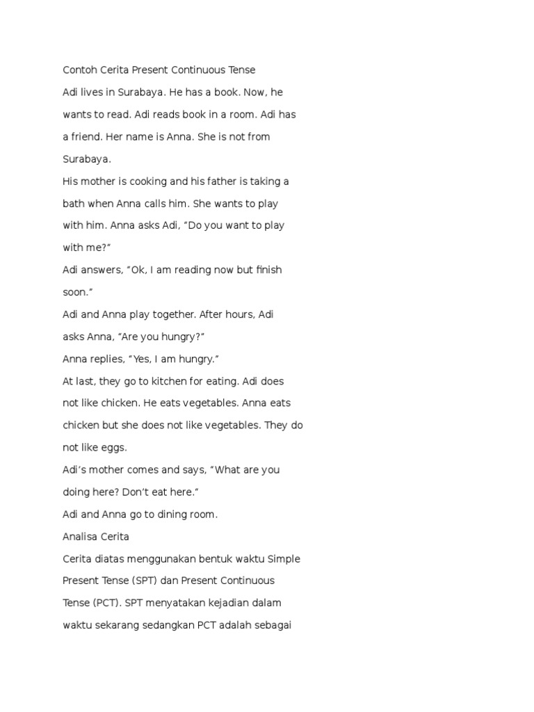 Contoh cerita menggunakan simple present tense. Salah satu syarat untuk bisa membuat contoh kalimat dalam bentuk tenses adalah mengetahui formula atau rumus. Berbeda dengan simple past tense yang menggunakan kata kerja lampau simple present tense adalah kalimat yang menunjukkan hal yang terjadi saat ini atau rutinitasnah salah satu kalimat kalimat yang biasa menggunakan simple present tense adalah daily activity. Lebih dari 10 kalimat. Simple present tense merupakan salah satu bentuk tense yang sangat sering digunakan baik dalam percakapan maupun dalam tulisan. Rumus simple present tense. Hal ini karena simple present tense memiliki banyak fungsi jika dibandingkan dengan tenses yang lain yang rata rata hanya memiliki fungsi untuk menjelaskan suatu pekerjaan pada satu waktu tertentu saja.