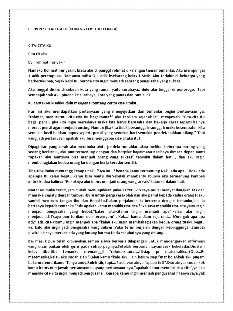 Cerpen bertema cita cita 1000 kata ok sobat educations kali ini saya mau share tentang cerpen bertema cita cita 1000 kata nah bagi yang ada tugas untuk membuat cerpen bertema cita cita maka cerpen fiktif ini bisa untuk dijadikan referensicerpen ini berceritakan tentang cita cita untuk melanjutkan ke sekolah yang diimpikannyaok langsung saja sob simak contoh cerpen karya saya berikut. Jadi ini sudah tergolong cerita pendek.