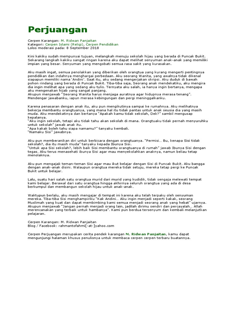 Kali ini kami akan membahas contoh cerpen persahabatan singkat dan unsur intrinsiknya meliputi dari indahnya sebuah persahabatan selamat tinggal engkau sahabatku supaya mudah di baca. 35 contoh cerpen singkat persahabatan pendidikan terbaik cinta lucu kehidupan sehari hari untuk pembahasan kali ini kami akan mengulas mengenai contoh cerpen yang dimana dalam hal ini meliputi pengertian cara membuat determinasi tumbuhan dan contoh nah agar lebih dapat memahami dan mengerti simak ulasan selengkapnya dibawah ini. Karena hal ini merupakan salah satu karya sastra. Pagi buta sebelum berangkat bekerja ibu salat subuh terlebih dahulu. Beban yang sangat berat dengan ikhlas dia tanggung tanpa sedikit pun mengeluh. Cerita pendek berjudul malaikat renta tersebut bercerita tentang keagungan dan kebesaran jiwa yang dimiliki oleh seorang ibu.