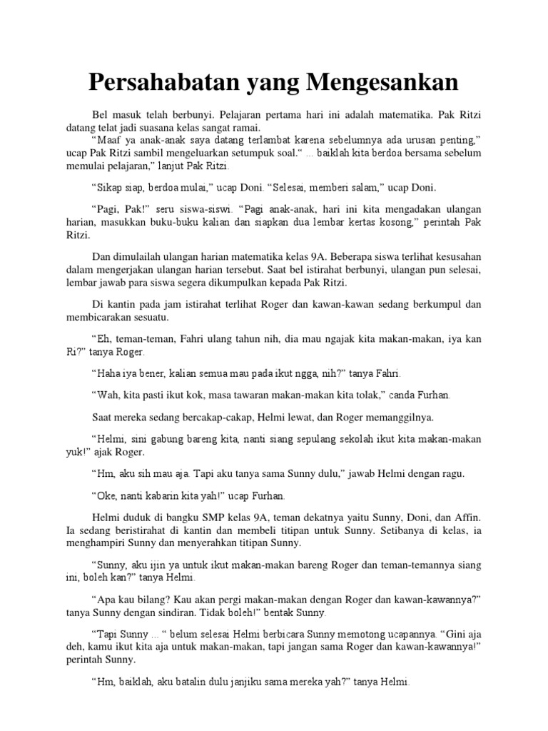 Contoh cerpen tentang sahabat. Cerpen persahabatan persahabatan adalah sebuah bumbu indah yang terdapat di dalam kehidupan seluruh umat manusia yang ada di muka bumi ini. Pada materi kami sebelumnya telah membahas tentang cerpen pendidikan cerpen remaja cerpen singkat namun di sini kami akan membahas cerpen persahabatan. Kebanyakan orang mengira cerpen itu sama dengan novel padahal dari segi jumlah kata aja sudah berbeda. Coba saja ingat masa masa remaja kalian dimana setiap pulang sekolah kalian bersama beberapa sahabat tertawa bersama di kantin sekolah untuk menikmati jam pulang sekolah sambil menghabiskan uang jajan kalian. Materi tentang cerita pendek alias cerpen pernah kami bahas secara khusus di artikel sebelumnya dimana materi tersebut berisi mengenai pengertian cerpen ciri ciri struktur cerpen unsur intrinsik dan ekstrinsik cerpen dan fungsinya. Karena hal ini merupakan salah satu karya sastra.