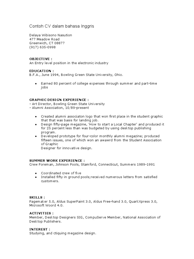 Membuat surat lamaran kerja dalam bahasa inggris sebenarnya tak ada bedanya dengan membuat surat lamaran kerja pada umumnya. Contoh surat lamaran kerja bahasa inggris dan artinya untuk 30 profesi ini bisa menjadi template atau rujukan bagi kamu saat menulis surat lamaran untuk setiap pekerjaan pilihan. Berikut 2 contoh cv dalam bahasa inggris beserta artinya yang bisa anda jadikan acuan saat anda akan. Cv lamaran kerja bahasa inggris yang menarik bukan hanya dilihat dari cover atau desain tetapi juga gaya penulisan dan kerapihan dad berbagai sisi. Untuk melamar kerja ke perusahaan besar cv kamu harus dalam bahasa inggris. Jika anda masih belum tahu bagaimana cara untuk membuat cv.