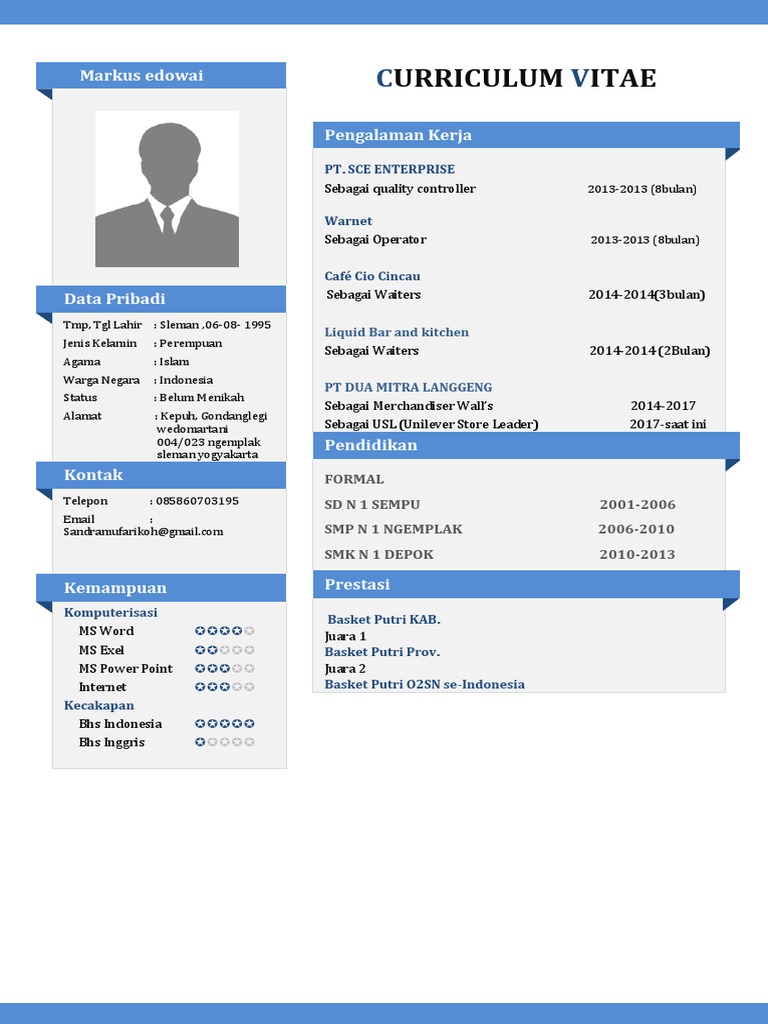 Contoh cv menarik 2017. Contoh cv bahasa indonesia yang lengkap menarik dan kreatif cv atau curriculum vitae yang berasal dari bahasa latin yang berarti jalan hidup. Mudah mudahan ketiga contoh cv di atas bisa membantu anda lulusan lulusan baru dalam membuat cv yang menarik baik dan benar. Posted on october 16 2017 in career tips human resources. Semoga contoh contoh curriculum vitae cv yang kami bagikan pada ulasan kali ini dapat berguna bagi anda terutama yang sedang mencari pekerjaan. Contoh cv curriculum vitae menjadi referensi utama para pelamar kerja dalam menyususun cv yang menarik sehingga mendapat perhatian hrd dan kemudian dapat diterima bekerja di perusahaan tersebut. Buat kamu yang sekarang baru cari cari kerja dan butuh contoh cv yang baik dan benar yuk cus disimak 10 contoh cv lamaran kerja di bawah ini.