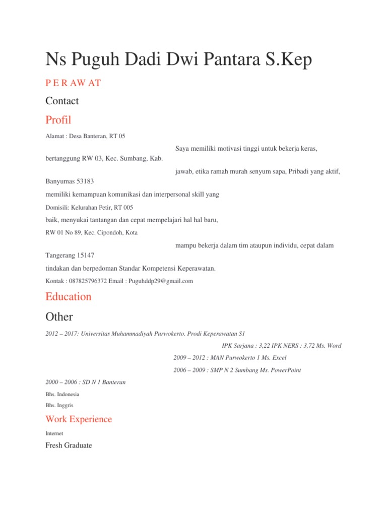 Contoh cv perawat fresh graduate. Alhasil hal hal yang bisa ditulis di cv atau daftar riwayat hidup menjadi cukup terbatas. Berbagai file template cv kosong atau contoh cv kreatif sudah bisa kamu download pada contoh contoh cv sebelumnya sesuai dengan jenis pekerjaan yang akan kamu lamar. Contoh cv lamaran kerja di bawah ini bisa digunkan oleh para profesional seperti tenaga engineering dokter atau dosen. Out of school activities are important especially for a young graduate but should not make your resume look like a travel sports and leisure advertising catalog. Satu hal yang berbeda dari cv fresh graduate yaitu tidak tercantum pengalaman kerja.
