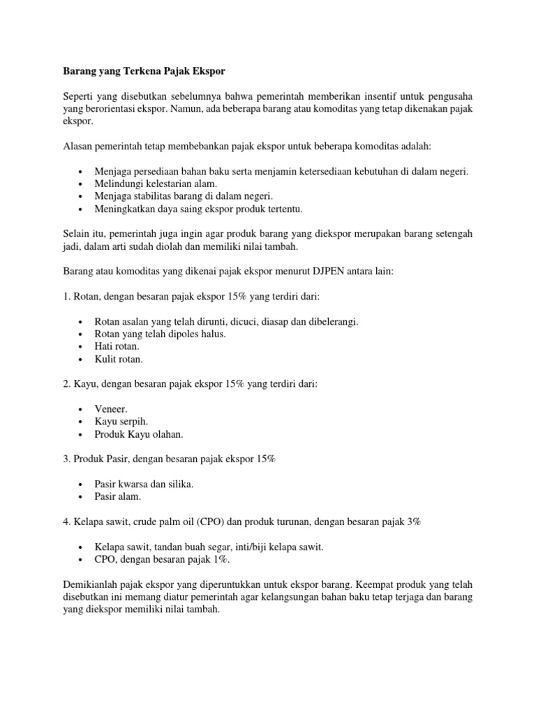 Contoh daftar barang yang terkena pajak ekspor. Barang yang terkena pajak ekspor. Menurut pasal 1 angka 2 uu nomor 42 tahun 2009 tentang perubahan ketiga atas undang undang nomor 8 tahun 1983 tentang pajak pertambahan nilai barang dan jasa dan pajak penjualan atas barang mewah barang adalah barang berwujud yang menurut sifat dan hukumnya dapat berupa barang bergerak atau barang tidak bergerak dan barang tidak berwujud. Berikut komoditas atau daftar barang yang terkena pajak ekspor menurut djpen. Dalam hal ini bea cukai berperan sebagai revenue collector. Namun ada beberapa barang atau komoditas yang tetap dikenakan pajak. Alasan komoditas ini perlu perlindungan adalah untuk menjamin tersedianya bahan baku guna kebutuhan di dalam negeri.