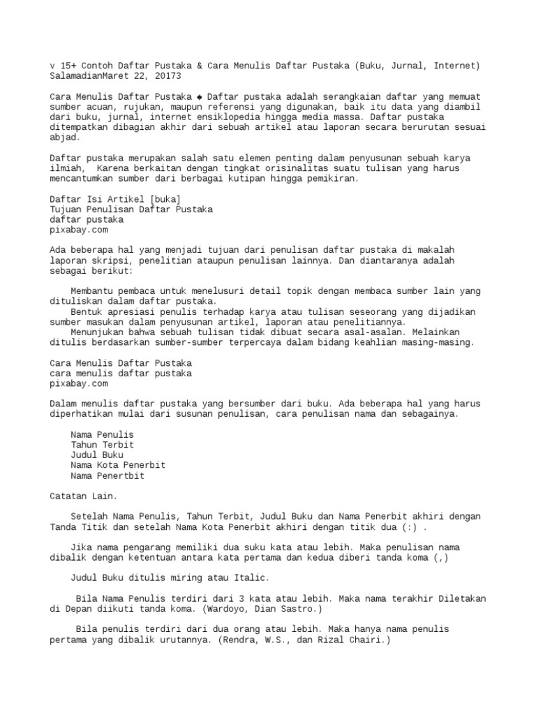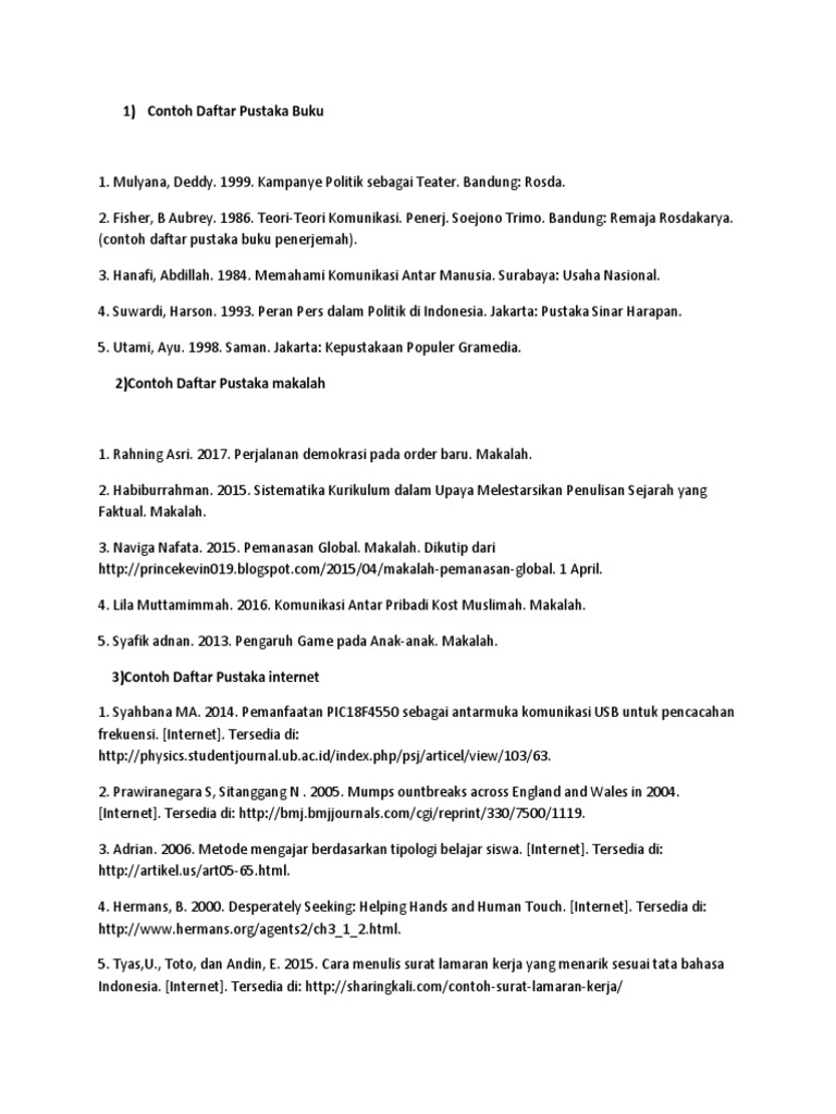 Contoh daftar pustaka yang diambil dari internet. Secara umum cara penulisan daftar pustaka dari internet sama dengan penulisan yang berasal dari sumber cetak seperti buku majalah jurnal dan sebagainya untuk digunakan membuat karya tulis ilmiah. Sedangkan daftar pustaka adalah serangkaian daftar yang memuat sumber rujukan referensi atau acuan dari suatu karya tulis yang diambil dari buku media cetak dokumen skripsi tesis ataupun jurnal ilmiah. Cara menulis daftar pustaka dari internet dengan format penulisan mla atau modern language association dengan susunan yaitu judul artikel nama website tanggal artikel dibuat waktu akses alamat website url lengkap. Hal ini dilakukan agar pengutip terhindar dari plagiarisme. Cara penulisan daftar pustaka dari internet untuk karya tulis ilmiah sebenarnya hampir sama dengan cara penulisan yang berasal dari sumber cetak seperti buku majalah jurnal dan sebagainyasedikit yang membedakan adalah sumber dari situs atau blog bersifat dinamis artinya bisa saja artikel telah mengalami perubahan atau bisa jadi situs telah dihapus dari internet. Supaya kamu lebih paham lagi berikut ini adalah video tentang contoh daftar pustaka yang pada umumnya sering dipakai.