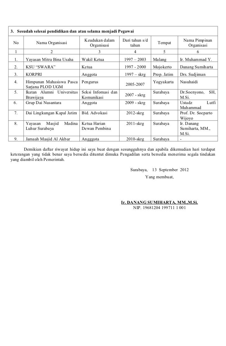 I ii b walikota sorong 8211150bkd 07 juli 2011 3 sk pegawai negeri sipil pengatur guru muda 01042013 sekarang pengatur ii c walikota sorong 8232213bkd2013 01 april 2013 demikian daftar riwayat pekerjaan ini saya buat dengan sesungguhnya. Bahkan daftar riwayat hidup tidak hanya dalam kepemilikan saja namun memang sangat penting untuk anda perhatikan. Contoh daftar riwayat hidup yang baik contoh daftar riwayat hidup untuk melamar pekerjaan contoh daftar riwayat hidup skripsi contoh daftar riwayat hidup 2017 contoh daftar riwayat hidup lamaran kerja contoh daftar riwayat pekerjaan contoh daftar riwayat hidup terbaru contoh daftar isi proposal contoh daftar riwayat hidup yang baik contoh daftar tabel. Cv merupakan sebuah dokumen persyaratan untuk melamar pekerjaan. Namun dalam kenyataannya daftar riwayat hidup sering juga diminta untuk berbagai keperluan lain seperti pendaftaran guru atau kepala sekolah berprestasi pendataan ulang pns dan lainnya. Surat dpcp berkas pensiun.