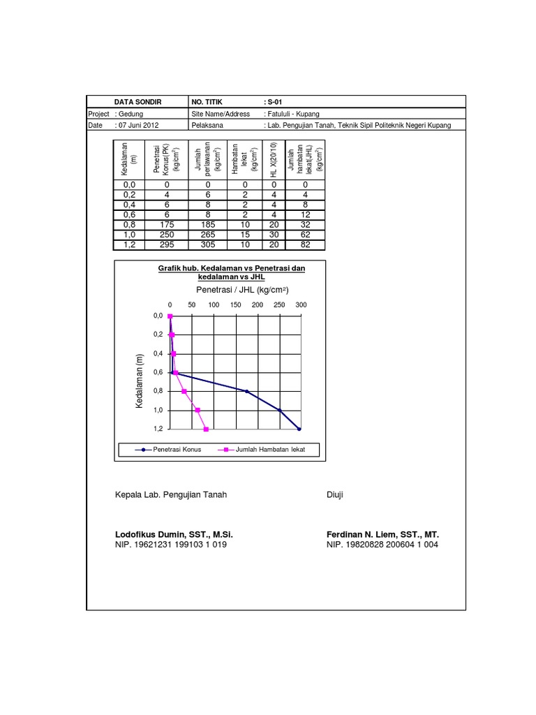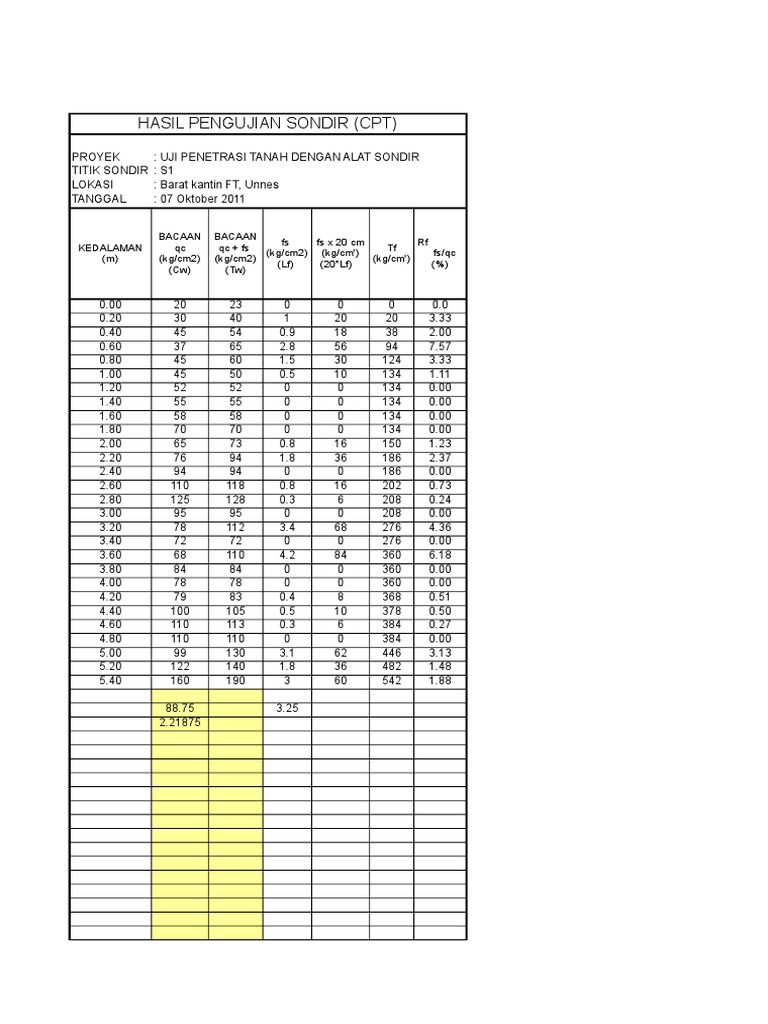 Contoh data sondir tanah lengkap. Jumlah titik pengambilan data sebanyak 11 titik dengan. Daftar pengalaman jasa uji sondir geochem survey biaya jasa uji sondir. Kelebihan uji sondir tanah diperiksa dalam keadaan asli data lengkap seluruh kedalaman sederhana kekurangan uji sondir tidak dapat dipakai lapisan tanah keras pengujian empiris sehingga korelasi dengan parameter parameter lain jadi dengan melakukan pengujian sondir kita dapat mendesain pondasi dengan aman agar bangunan kuat dan kokoh. Lapisan tanah keras untuk nilai qc 100 kgcm2 cukup dalam ditemukan dikedalaman antara 2620 m sampai 2660 m. Pengertian uji tanah sondir dan boring test. Daya dukung tanah dari data sondir.