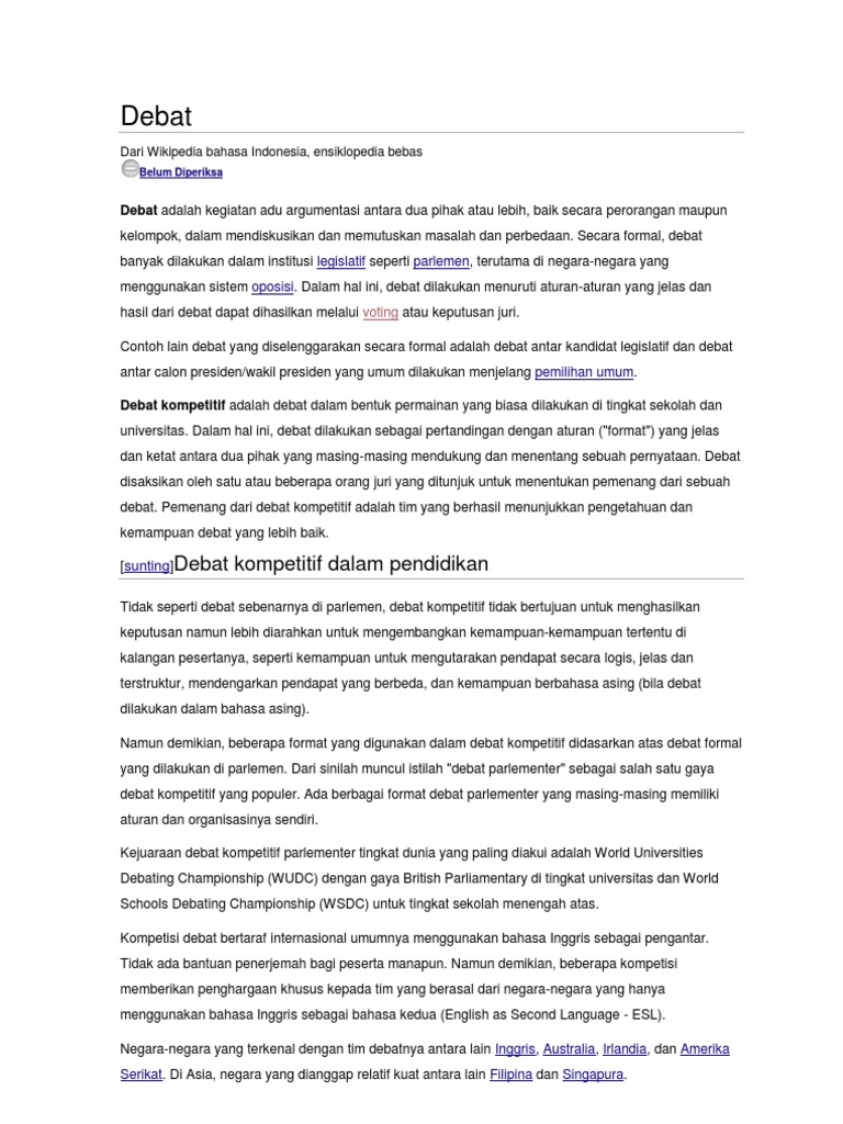 Contoh debat bahasa indonesia tentang pendidikan. Di dalam proses debat ini penyedia jasa konstruksi atau calon kontraktor mengajukan penawaran agar dapat pemahaman tentang debat dan penggunaan keterampilan bahasa memperoleh proyek tersebut. Contoh teks ini juga akan membuat gambaran dan referensi sebelum melakukan lomba debat atau membuat teks debat sendiri. Nah untuk lebih jelasnyqa kalian bisa simak berikut ini. Contoh teks argumentasi bahasa inggris tentang pendidikan artinya. Menurut kbbi kamus besar bahasa indonesia debat merupakan suatu pembahasan atau pertukaran pendapat tentang suatu hal dengan saling memberi alasan demi mempertahankan pendapat masing masing. Sehingga contoh teks debat sangatlah berguna untuk membuat debat berjalan lancar dan baik serta tugas terpenuhi.