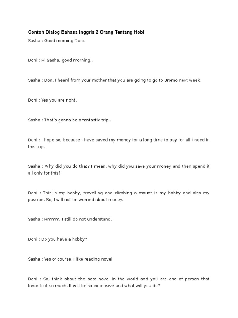 Contoh dialog bahasa inggris. Semoga contoh soal dialog bahasa inggris tentang ekspresi ekspresi tersebut dapat membantu pembaca baik untuk mempersiapkan diri untuk menghadapi soal bagi anda siswa siswi maupun untuk membuat soal ujian bagi anda pendidik pendidik yang budiman. Salah satu bagian penting dalam mempelajari suatu bahasa adalah kemampuan berbicara speaking. Contoh percakapan dalam bahasa inggris dan terjemahannya. Untuk mengenal lebih jauh bagaimana caranya memberi saran dalam bahasa inggris berikut contoh contoh percakapan expressing of suggestion. Inilah inti dari mempelajari suatu bahasa yaitu untuk mempermudah berkomunikasi dengan orang lainnya yang menggunakan bahasa yang sama. Kali ini saya memberikan contoh teks perkenalan diri dalam bahasa inggris.