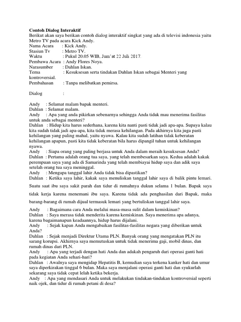 Contoh teks dialog interaktif singkat dan menarik mungkin dari kalian ada yang belum tahu apa itu dialog interaktif. Dialog interaktif adalah kegiatan berdiskusi yang membahas sebuah topik yang sedang banyak diperbincangkan menghadirkan orang yang ahli pakar dalam topik tersebut sebagai narasumber. Contoh soal dialog interaktif singkat dan panjang lengkap by mughnifar ilham posted on march 17 2020 contoh soal dialog interaktif dialog interaktif adalah sebuah dialog atau perbincangan atau percakapan yang dilakukan pada sebuah acara di televisi atau radio antara pembawa acara dengan pendengar melalui sambungan telepon. Dialog interaktif adalah materi smp kelas 9 yang akan kita pelajari kali inidialog interaktif ini sangat sering kita jumpai di berbagai media massa terutama tv. 5 contoh dialog interaktif. Contoh dialog interaktif singkat 2018 beserta kesimpulannya acara hitam putih terbaru tv one tentang pendidikan kebersihan dll.