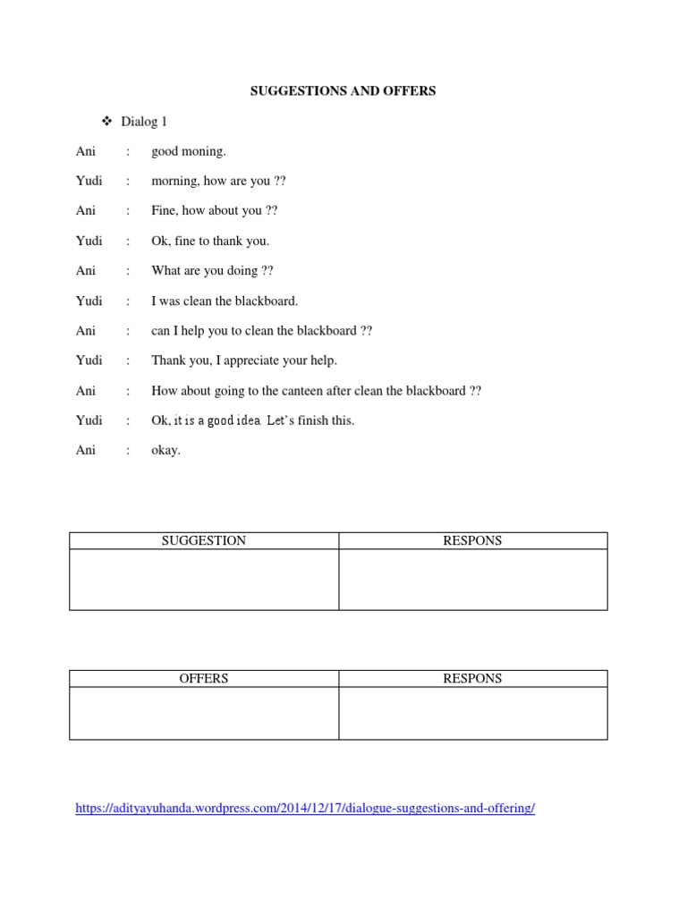 By om min posted on october 6 2016. Examples of formal words. Sebelum melihat beberapa contoh dialog bahasa inggris expressing offering help mari kita pahami terlebih dahulu pengertiannya. Contoh teks dialog dramapawayangan basa sunda lengkap. Bagi kalian yang kelas 11 sma materi ini bisa dilihat di buku bahasa inggris kurikulum 2013 kelas xi halaman 8 12. 63 contoh dialog suggest offer inilah yang akan kita pelajari kali ini suggest and offer.