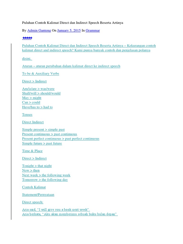Pengertian direct indirect speech direct speech adalah suatu kalimat yang diucapkan secara langsung oleh pembicara yang dalam penulisannya disertai dengan tanda aphostrof di awal dan akhir kalimatnya sebagaimana teks dialog atau percakapan. She said i will go to the market. Soal direct indirect speech pengertian direct dan indirect speech. 5 contoh soal direct and indirect speech. Ini dia peraturan direct and indirect speech yang harus kamu ketahui.