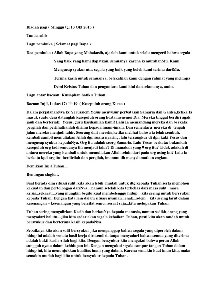 Namun jika anda kesulitan untuk menyusun doa pembuka dari ayat alkitab berikut ini telah disiapkan doa pembukaan ibadah keluarga kristen protestan katolik pemuda gereja sekolah minggu atau ibadah gereja lainnya. Perlu dipahami bahwa hanya dengan membawakan doa pembuka sudah merupakan bentuk bentuk pelayanan di gerejakarena melalui doa di awal ibdah tersebut tentunya tuhan yesus akan hadir di tengah tengah umatnya melalui perantaraan peran roh kudus dalam kehidupan orang percayasehingga nantinya ibadah berjalan lancar dan firman tuhan akan. Di bawah ini adalah salah satu contoh doa pembuka kegiatan ibadah di gereja agama kristen baik katolik maupun protestan yang singkat padat dan jelas. Contoh 1 doa pembuka ibadah gereja yang mudah diucapkan. Dalam setiap ibadah kristen baik di gereja ataupun ibadah keluarga di rumah sudah tentu ada susunan ibadah. Berikut adalah contoh doa pembukaan ibadah kristen.