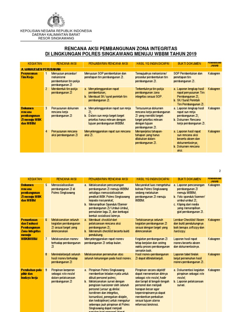 Contoh dokumen rencana kerja pembangunan zona integritas. Diharapkan melalui pembangunan zona integritas ini unit kerja yang telah menjadi wbkwbbm dapat menjadi pilot project dan benchmark untuk unit kerja lainnya sehingga seluruh unit kerja tersebut diberikan kebebasan untuk bekerja dengan benar sesuai dengan ketentuan perundangan undangan. Pedoman pembangunan zona integritas menuju wilayah bebas dari korupsi wbk dan wilayah birokrasi bersih dan melayani wbbm. Tindak lanjut rencana kerja pembangunan zona integritas menuju wilayah bebas korupsi wbk dan wilayah birokrasi bersih dan melayani wbbm di bappeda kota banda aceh tahun 2017. Penyusunan dokumen rencana kerja pembangunan zona integritas menuju wbkwbbm 2. Tetapkan unit kerja yang akan dijadikan zona integritas menuju wilayah bebas dari korupsi wbkwilayah birokrasi bersih dan melayani wbbm. Pencanangan pembangunan zona integritas secara terbuka dapat dilakukan bersama sama bagi instansi pusat yang berada di bawah koordinasi kementerian dapat dilakukan bersama bersama.