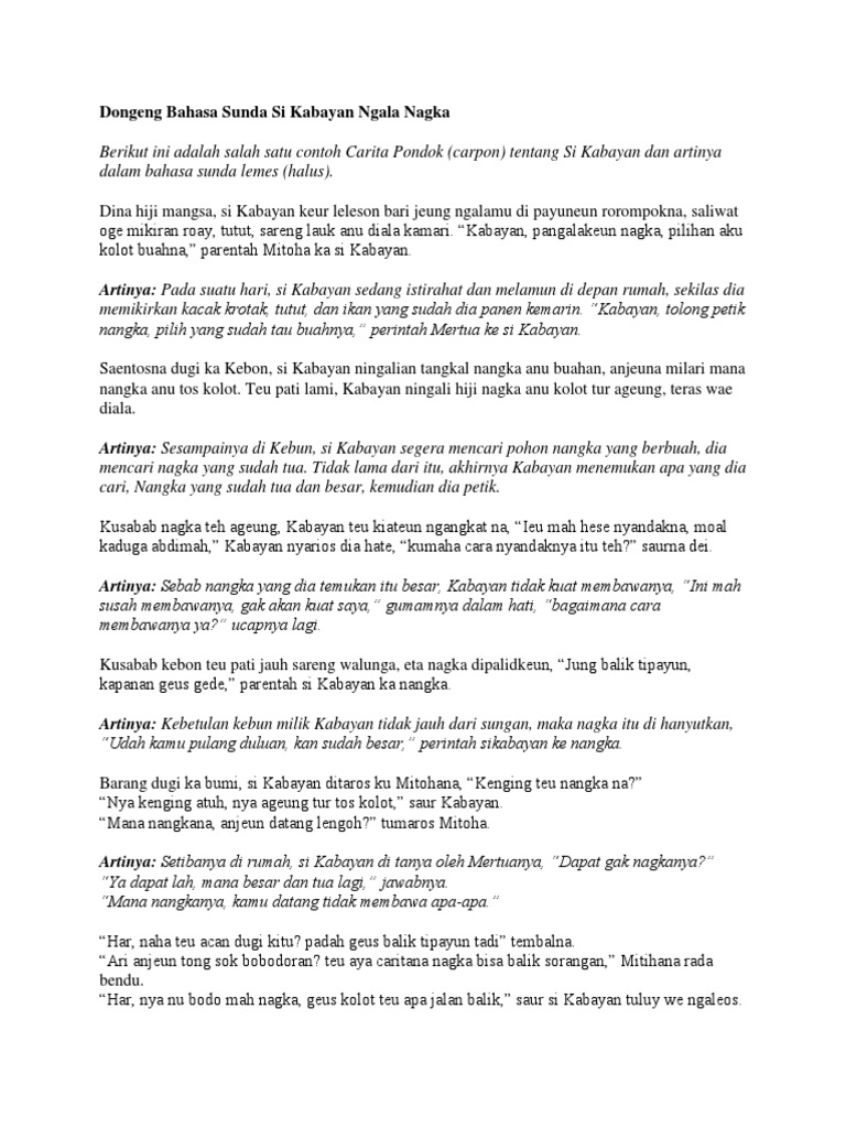 Contoh dongeng bahasa sunda. Dongeng sunda legenda atau dalam yang bahasa sunda biasa disebut juga dengan dongeng sasakala adalah salah satu jenis dongeng yang menceritakan mengenai asal muasal suatu peristiwa atau tempat yang dipercaya oleh beberapa masyarakat setempat bahwa kejadian atau cerita tersebut benar benar ada atau pernah terjadi namun tidak dianggap sebagai keramat atau sakral seperti cerita mitos ataupun mite. Ari kandulan teh jahejago he es beuki sare teu kaop nyangkere atawa nyarande sok ker wae kerek. Cut nya dien versi bahasa sunda. Biografi bahasa sunda 10 years ago cerpen tentang facebook bag01. Baheula aya hiji randa beunghar katelahna nyi endit. Oleh dosen pendidikan 2 diposting pada 16022020.