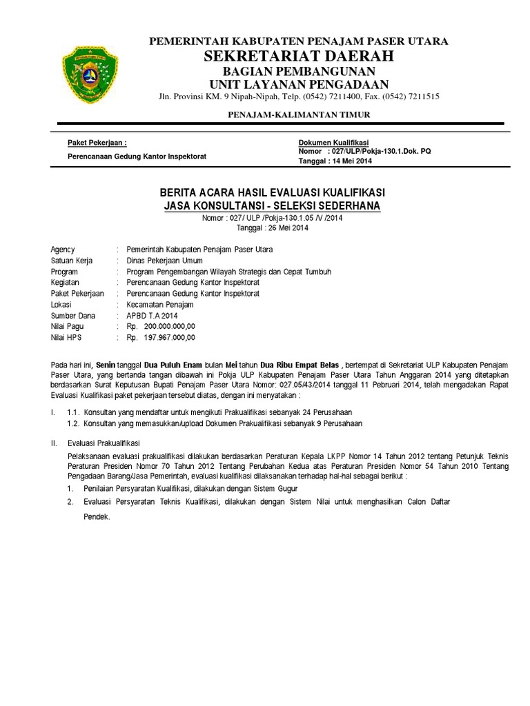 Contoh evaluasi kualifikasi jasa konsultansi. Mau berbagi pengalaman sekaligus bertanya saya mengikuti tender dengan pagu 17 miliar saya lolos evaluasi kualifikasi teknis dan harga kemudian saat saya mengikuti klarifikasi pembuktian saya digugurkan karena salah satu skt dari tenaga saya terbaca skt nya diregistrasi tahun 2018 sedangkan pengalaman yang diminta 3 tahun saya mengatakan. Pengguna jasa konsultansi adalah kepala kantorsatuan kerjapemimpin proyekpemimpin bagian proyekpengguna anggaran daerah pejabat yang disamakan sebagai pemilik pekerjaan yang bertanggung awab atas pelaksanaan pengadaan jasa dalam lingkungan unit kerjaproyek tertentu. Dalam sbd jasa konsultansi badan usaha dengan prakualifikasi sistem 2 sampul telah dijelaskan unsur unsur yang dinilai dalam evaluasi dokumen teknis seleksi jasa konsultansi beserta bobot bobotnya yaitu pada point 24. Oleh karena sampai saat ini 15 april 2019 kementerian pupr belum menerbitkan sdp more. Buku pk 08 pedoman penyusunan dokumen pelelangan. Waktu bab v.
