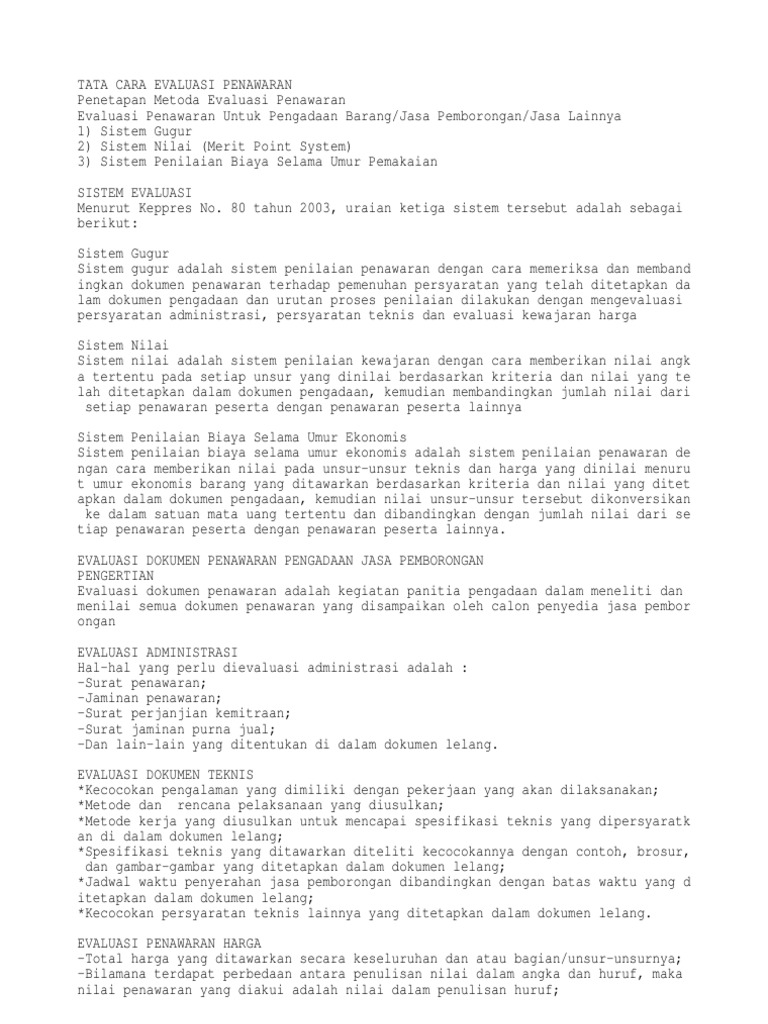 4 evaluasi teknis dalam sistem gugur dapat menggunakan sistem ambang batas terhadap unsur teknis yang dinilai 5 dalam hal evaluasi teknis dengan sistem gugur menggunakan ambang batas nilai teknis penawaran dinyatakan lulus teknis apabila masing masing unsur maupun nilai total keseluruhan unsur memenuhi ambang batas minimal yang ditetapkan dalam dokumen pemilihan. Berikut ini contoh format evaluasi penawaran untuk pelelangan umumpemilihan langsung untuk pekerjaan konstruksi dengan menggunakan sistem gugur pasca kualifikasi. Metode evaluasi sistem nilai hanya digunakan untuk pekerjaan kompleks dengan kriteria tertentu sesuai perpres 542010 pasal 1 ayat. Tujuan dan manfaat penelitian a. Karena kerumitan di atas maka pada peraturan presiden nomor 54 tahun 2010 pasal 48 metode evaluasi untuk pengadaan barangpekerjaan konstruksijasa lainnya pada prinsipnya menggunakan metode evaluasi sistem gugur. Metode evaluasi sistem gugur sistem gugur adalah evaluasi penilaian penawaran dengan cara memeriksa dan membandingkan dokumen penawaran terhadap pemenuhan persyaratan yang telah ditetapkan dalam dokumen pemilihan penyedia barangjasa dengan urutan proses evaluasi dimulai dari penilaian persyaratan administrasi persyaratan teknis dan kewajaran.
