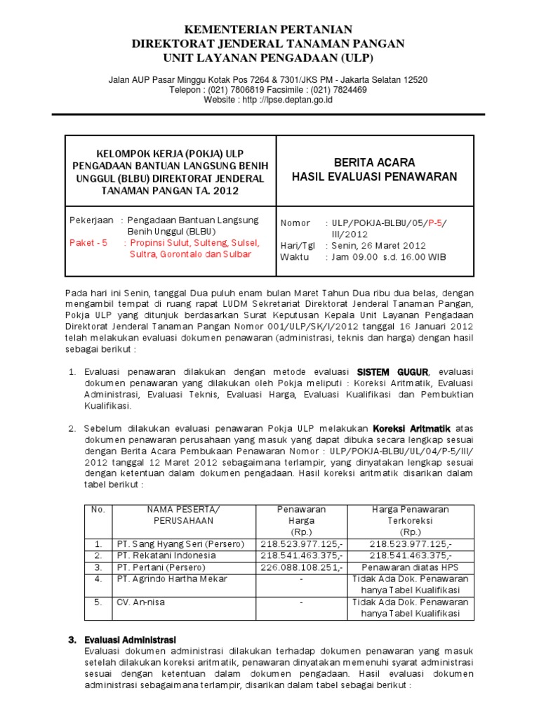 Contoh evaluasi penawaran sistem gugur. Jika pada satu tahapan syarat yang ditentukan tidak terpenuhi oleh salah satu penyedia penyedia tersebut tidak akan melanjutkan ke tahapan berikutnya. Penawaran dinyatakan lulus teknis apabila masing masing unsur maupun nilai total keseluruhan unsur memenuhi ambang batas minimal sebagaimana tercantum dalam dokumen pengadaanldp. Metode evaluasi dengan sistem gugur merupakan evaluasi penilaian penawaran dengan cara memeriksa dan membandingkan dokumen penawaran terhadap pemenuhan persyaratan minimal yang telah ditetapkan dalam dokumen pemilihan penyedia barangjasa dengan urutan proses evaluasi dimulai dari penilaian persyaratan administrasi persyaratan teknis dan kewajaran harga dan terhadap penyedia barangjasa yang. Sistem gugur dilaksanakan dengan membandingkan dokumen penawaran terhadap dokumen lelang dengan urutan tahap administrasi teknis dan harga. Evaluasi penilaian penawaran dengan cara memeriksa dan membandingkan dokumen penawaran terhadap pemenuhan persyaratan yang telah ditetapkan dalam dokumen pemilihan penyedia barangjasa yang telah ditetapkan dalam dokumen pemilihan barangjasa dengan urutan proses evaluasi dimulai dari penilaian kewajaran harga terhadap penyedia barangjasa yang tidak lulus penilaian pada setiap. Evaluasi yang menggunakan sistem gugur dengan ambang batas dilakukan dengan membandingkan pemenuhan persyaratan teknis perolehan nilai unsur dan sub unsur yang ditetapkan dalam ldp.
