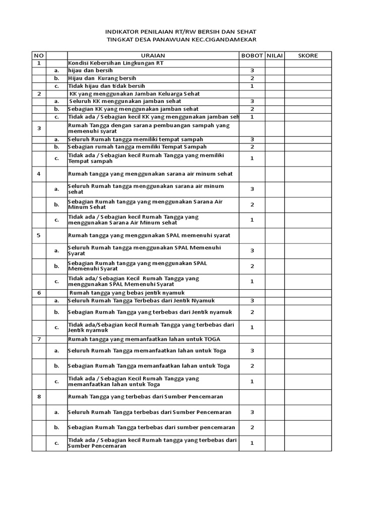 Contoh format penilaian lomba kebersihan lingkungan. Kebersihan kaca dan jendela d. Tidak ada sampah atau kotoran dilantai di dalamruang 2. Ada banyak cara yang konsultan kebersihan industri keselamatan tempat kerja dapat membantu anda menjadi lebih aman. 3 kebersihan meja kantor 3 kerapian kursi kursi diruangan 4 kebersihan kursi kantor 4 kerapian rak lemari. Ketersediaan tempat sampah 2. Bengkalis dalam rangka meningkatkan kebersihan lingkungan desa dan keamanan pemerintah desa pedekik akan mengadakan lomba kebersihan dan keaktifan pos kamling antar rw tahun 2014.