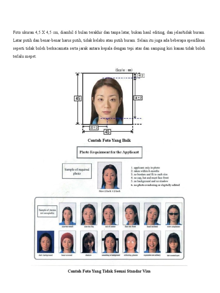 Saat mengajukan visa non imigran anda diharuskan untuk mengunggah sebuah foto elektronik sebagai bagian dari pengisian dan pengajuan formulir aplikasi ds 160anda juga harus membawa foto ke kedubeskonsulat. Mulai tanggal 1 september 2012 pemerintah jepang akan menerbitkan visa kunjungan sementara berkali kali multiple visa bagi wni yang berdomisili di indonesia dan berencana berkunjung ke jepang untuk tujuan wisata kunjungan keluarga dan kunjungan sementara lainnya yang tidak berhubungan dengan pekerjaanbisnis. Aku saranin ambil foto lagi deh karena syarat untuk foto visa jepang diambil 6 bulan terakhir. Foto berukuran 45x45 cm dengan kepala 27 mm yang memenuhi semua persyaratan. Vfs global adalah perusahaan komersial yang diberikan otoritas oleh kedutaan jepang di jakarta untuk meberikan informasi mengenai prosedur dan persyaratan yang lengkap untuk visa jepang kepada calon pemohon visa dan untuk menerima aplikasi visa. Dokumen dokumen yang perlu dilengkapi dalam mengajukan permohonan visa.