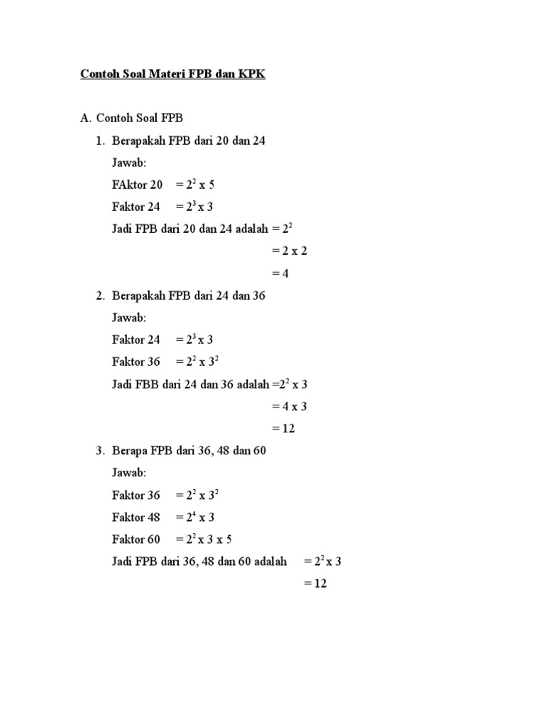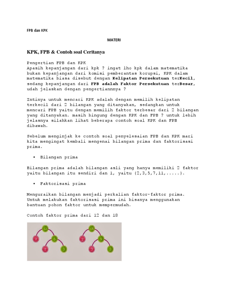 Kpk dan fpb merupakan salah satu materi yang diajarkan sejak duduk dibangku sd apa sampai sekarang materi matematika tersebut masih ada dalam ingatan kita. Bagi yang ingat ingat lupa dalam artikel ini akan dijabarkan kembali mengenai kpk dan fpb dari definisi cara mencari serta berbagai contoh soal mengenai kpk dan fpb. Hasil kali semua faktor dan ambil faktor dengan pangkat terbesar untuk faktor ynag sama. Kpk dari 12 dan 20 adalah kelipatan sekutu sama yang terkecil yaitu 60. Dalam mencari kpk dan fpb dibutuhkan hal tentang bilangan prima dan faktorisasi prima apa sih maksud dari kedua kata tersebut. Materi kpk dan fpb disertai contoh soal kpk dan fpb merupakan salah satu materi matematika yang cukup mudah untuk dipelajari karena materi fpb dan kpk merupakan implementasi dari pemfaktoran yang artinya sama juga dengan penjulahan pengurangan perkalian dan pembagian itu sih menurut admin untuk mencari fpb dan kpk yang perlu kalian ketahui sebelumnya yaitu mengenai bilangan prima dan.