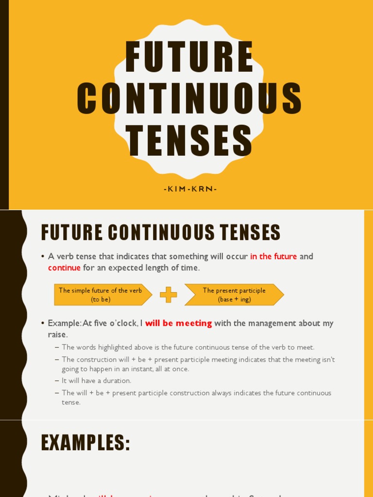 Contoh future continuous tense. The future continuous tense sometimes also referred to as the future progressive tense is a verb tense that indicates that something will occur in the future and continue for an expected length of time. Kalimat future continuous tense juga memiliki 2 bentuk yaitu will dan going to memiliki makna yang sama dan bisa saling menggantikan saat digunakan. Berbeda dengan penggunaan pada simple future tense. Future continuous tense atau future progressive tense merupakan bentuk kata kerja yang digunakan untuk menyatakan kejadian yang akan sedang berlangsung pada suatu waktu di masa yang akan datang dengan keterangan waktu yang spesifik. Future continuous tense atau future progressive tense adalah bentuk kata kerja yang digunakan untuk menyatakan aksi yang akan sedang terjadi pada waktu tertentu di masa depan. Sangat penting untuk memperhatikan bahwa future continuous tense hanya digunakan dengan action verb karena action verb bisa saja mempunyai durasi waktu.