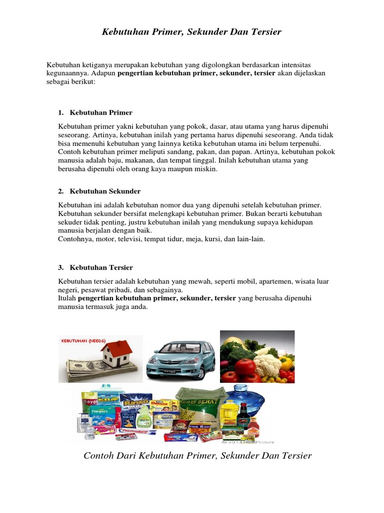 Kebutuhan tersier pengertian primer sekunder faktor contoh. Sebelum memenuhi kebutuhan hidup lainnya kebutuhan primer menjadi bagian. Semoga artikel ini dapat bermanfaat bagi sobat baik untuk mengerjakan tugas maupun untuk sekedar menambah wawasan tentang contoh kebutuhan primer kebutuhan primer kebutuhan manusia kebutuhan pokok manusia sandang pangan papan dan kebutuhan pokok. Contoh kebutuhan sekunder berdasarkan hierarki intensitas dan tingkat kegentinganya kebutuhan hidup manusia dapat diklasifikasikan menjadi 3 jenis yaitu kebutuhan primer kebutuhan sekunder dan kebutuhan tersier. Sekian artikel mengenai 20 contoh kebutuhan primer dengan gambar dan penjelasan. Contoh dari kebutuhan primer.