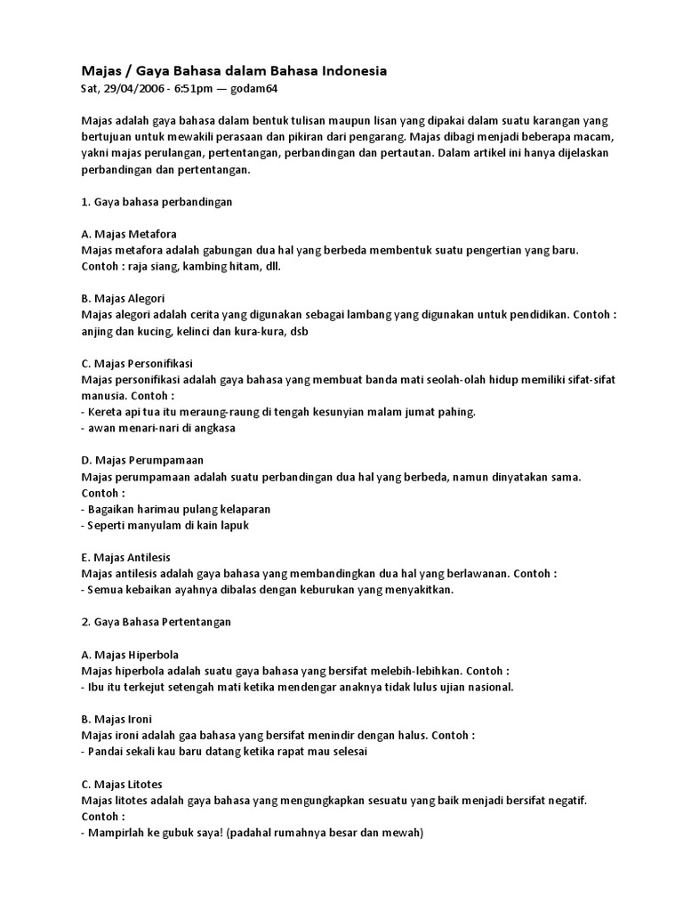 Majas sendiri ada beberapa macam jenisnya dan tentunya beda beda arti dan penggunaannya. Mudah kok intinya kalimat nya berlebih lebihan sampai sampai tidak masuk akal. Adalah gaya bahasa yang dipakai untuk memperjelas maksud dengan menggunakan kata berulang dan maknanya sudah dikandung oleh kata yang mendahului. Akan kutunggu walaupun seribu tahun lamanya. Kadangkala ada akhir tak ada mula. Majas merupakan salah satu gaya bahasa dalam bahasa indonesia yang biasa di gunakan untuk menceritakan atau menggambarkan sesuatu dengan lebih imaginatif.