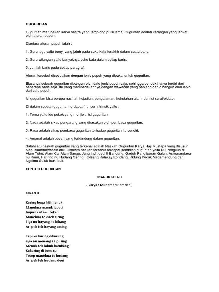 Contoh guguritan pupuh kinanti. Sanajan ge kudu nunggu 8 u karasa bungah di ati 8 i teu aya rasa guligah 8 a. Agar lebih jelas berikut ini contoh kumpulan pupuh sunda yang berjumlah 17. Pupuh téh nyaéta wangun puisi lisan tradisional sunda atawa mun di jawa katelah ogé macapat nu tangtu pola jumlah engang jeung sora kalimahnanalika can pati wanoh kana wangun puisisastra modérn pupuh ilahar dipaké dina ngawangun wawacan atawa dangding luyu jeung watek masing masing pupuh nu ngawakilan kaayaan kajadian nu keur dicaritakeun. Urang sunda mangrupakeun salah sahiji séké sélér nu ngeusi utamana bagian kulon pulo jawa populasi kadua panglobana di indonésialuyu jeung sajarahna urang sunda lolobana sumebar di lemah caina nu kiwari sacara administratif sumebar di propinsi jawa kulon banten jawa tengah dki jakarta jeung lampung kidul. Hal ieu bias jadi aya patalina jeung kabeungharan variasi lagu keur pupuh eta atawa jeung sipat lalaguanana. Pupuh berasal dari bahasa sunda yaitu pepeuh adalah bentuk puisi tradisional bahasa sunda yang memiliki jumlah suku kata dan rima tertentu di setiap barisnya.